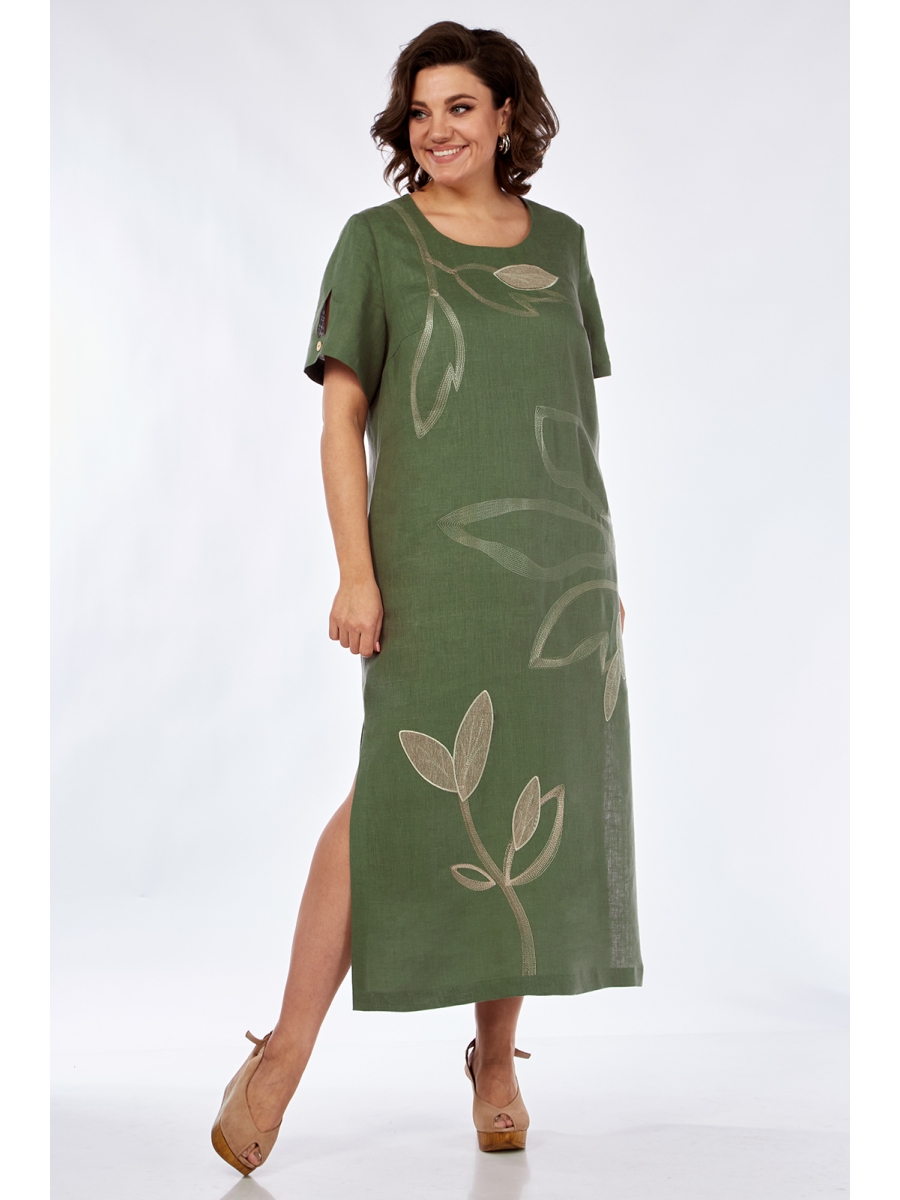 Платье женское прямого силуэта, изготовлено из натуральной ткани. Горловина круглой формы. По переду нагрудные вытачки. На спинке средний шов. В боковых швах обработаны карманы, внизу разрезы. Рукава втачные, разрезные с фигурным вырезом. Платье декорировано дизайнерской вышивкой.