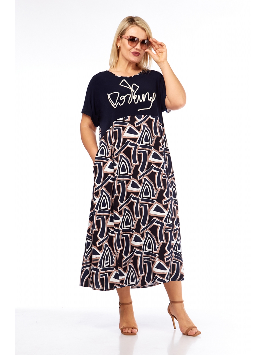 Платье женское А-силуэта, комбинированное. Верх переда и спинки выполнены из трикотажного полотна. Горловина круглой формы, окантована. По переду вышивка шнуром. Спинка разрезная, по горловине застежка на навесную петлю и пуговицу. Рукава спущенные с манжетами внизу. В боковых швах обработаны карманы.