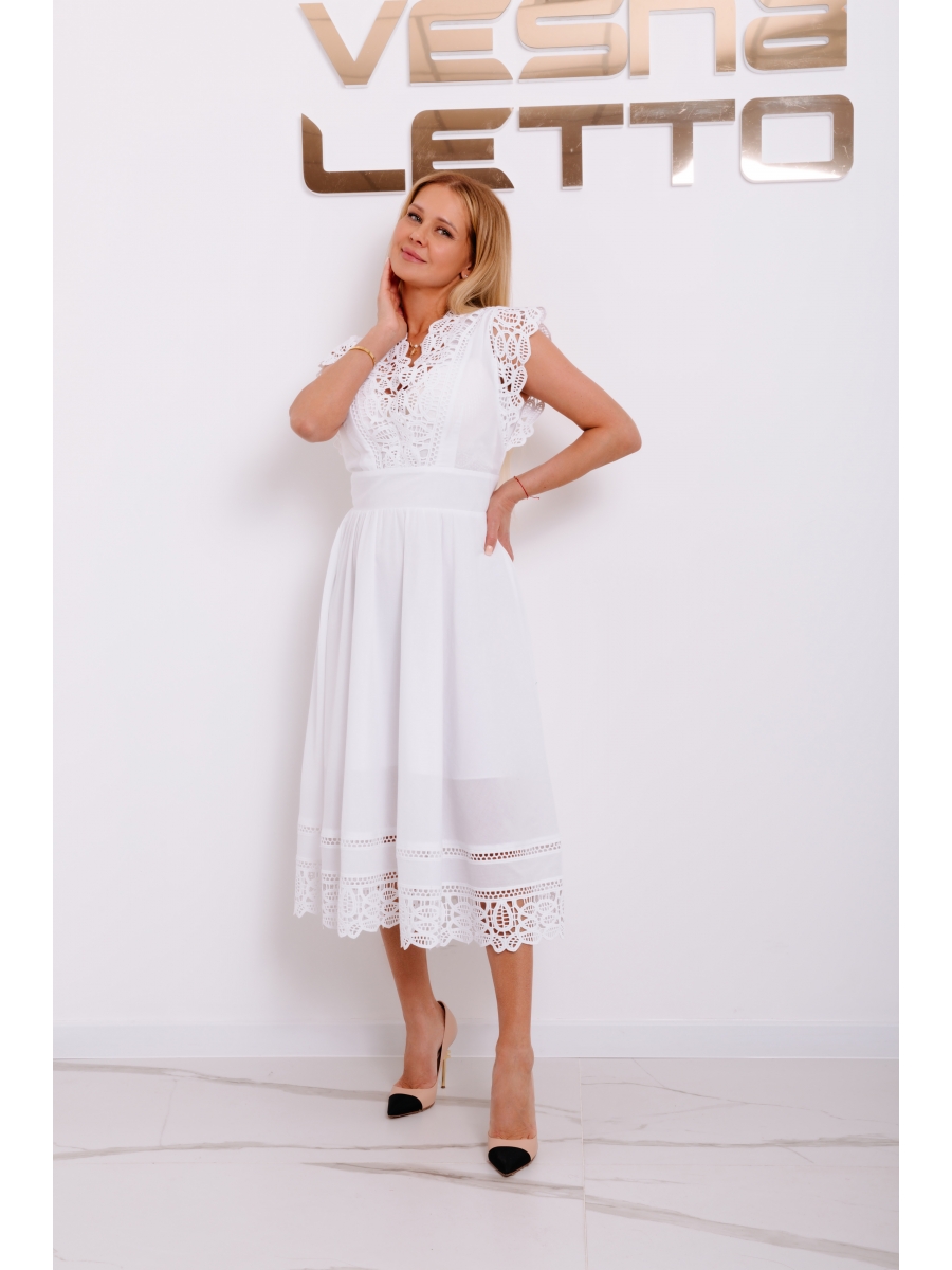 Платье летнее из хлопка «шитье». Длина миди. Полуприлегающий силуэт. Вырез горловины V-образный. На переде прорезные карманы. Застежка на петли и пуговицы. Юбка со складками. Верх с воланами и съемной бретелью на левом плече. Платье на подкладке.