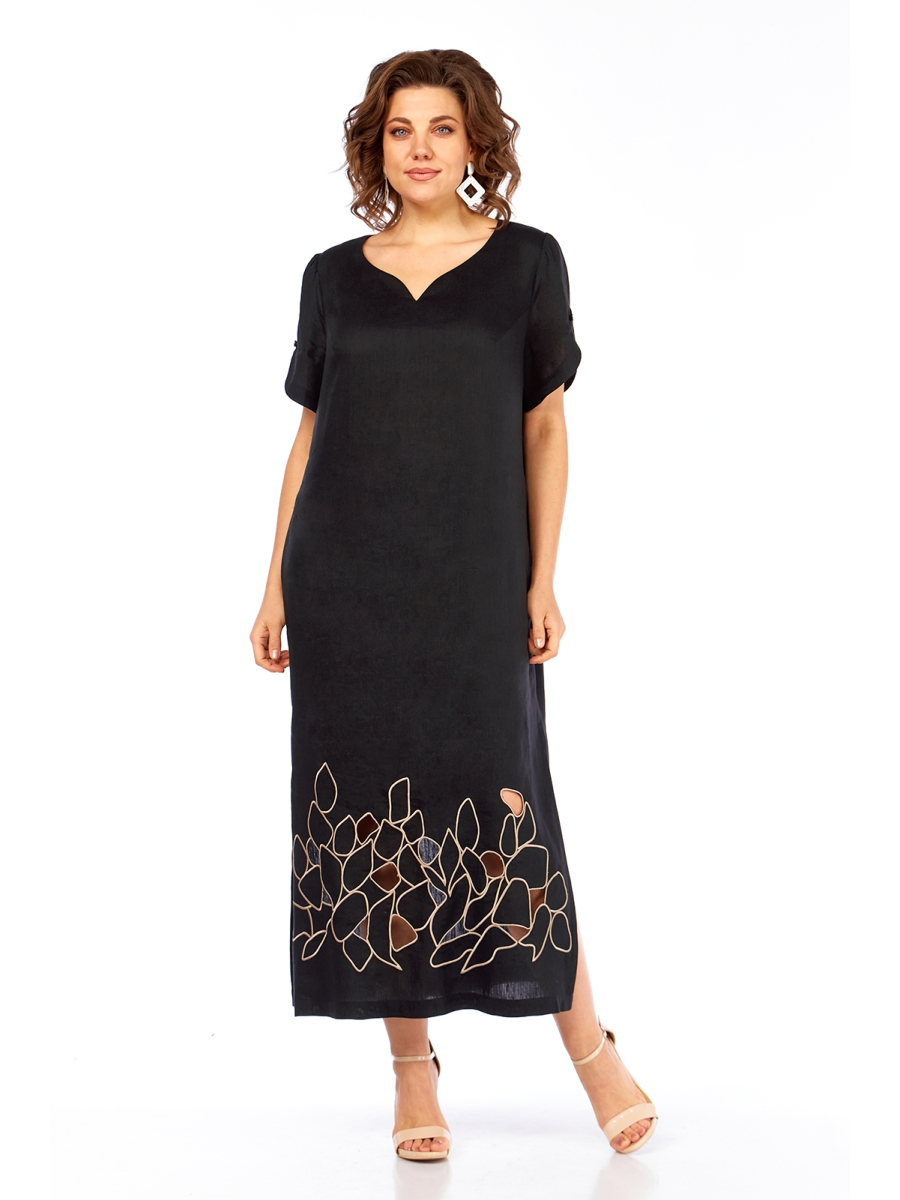 Платье женское, прямого силуэта, выполнено из льняной ткани с фигурным вырезом по горловине. По переду обработаны нагрудные вытачки. Спинка цельнокроенная. Рукава втачные, по окату рукава сборка, нижний срез фигурной формы. Рукав декорирован навесной петлей и пуговицей. Платье дополнено дизайнерской вышивкой в стиле ришелье.