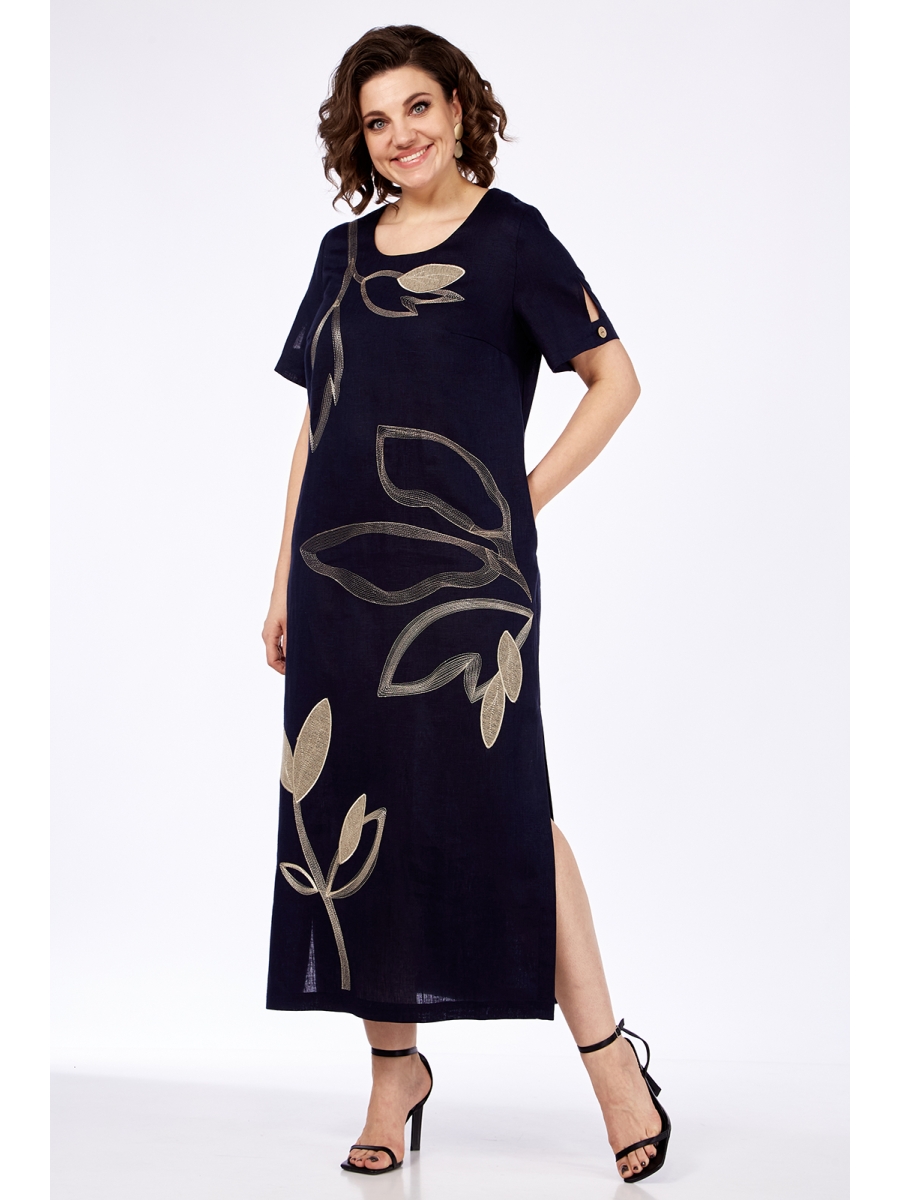 Платье женское прямого силуэта, изготовлено из натуральной ткани. Горловина круглой формы. По переду нагрудные вытачки. На спинке средний шов. В боковых швах обработаны карманы, внизу разрезы. Рукава втачные, разрезные с фигурным вырезом. Платье декорировано дизайнерской вышивкой.