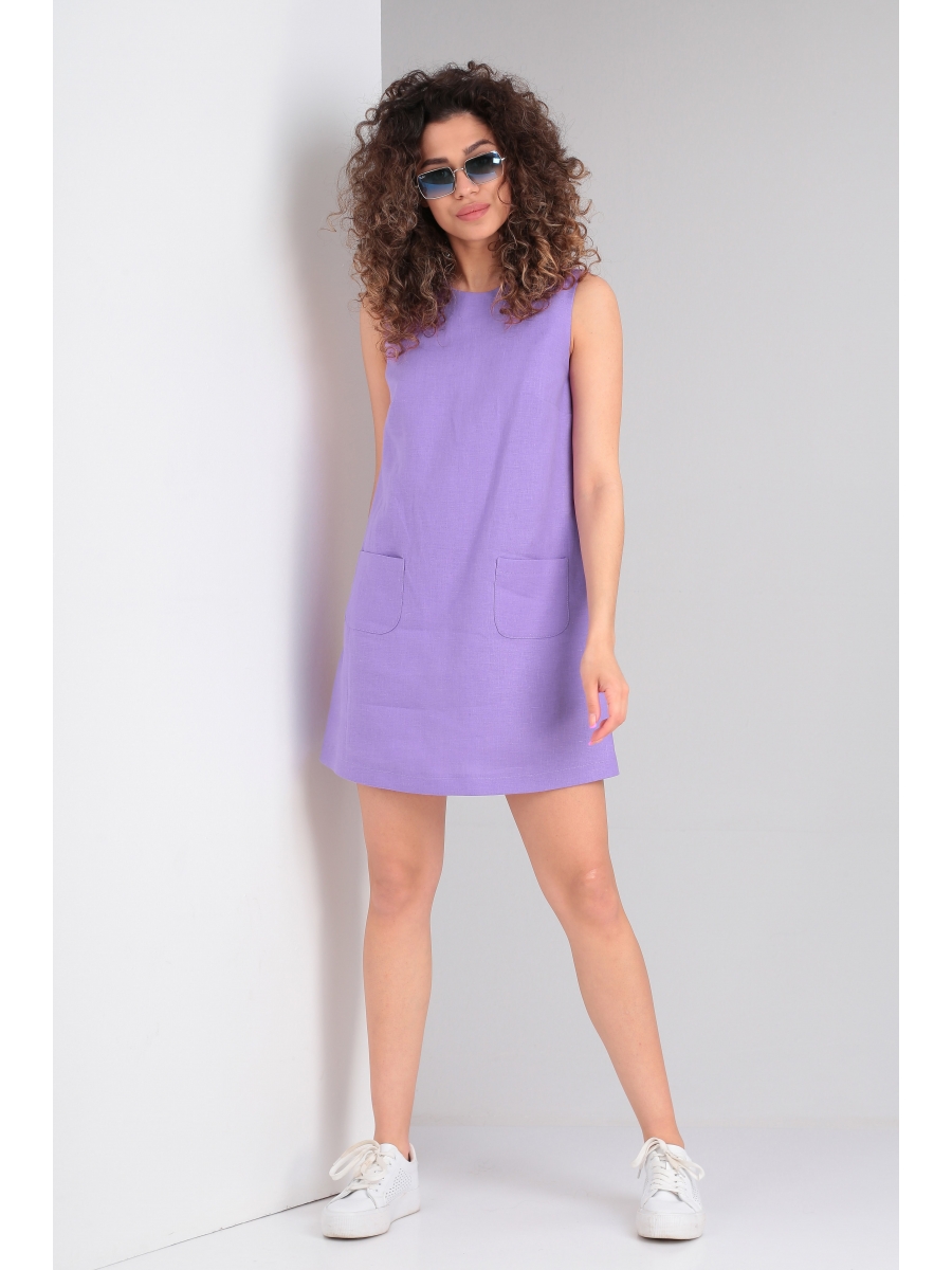 Мини платье А-образного силуэта с накладными карманами из натурального умягченного льна, без рукава. В центральном шве спинки застежка молния