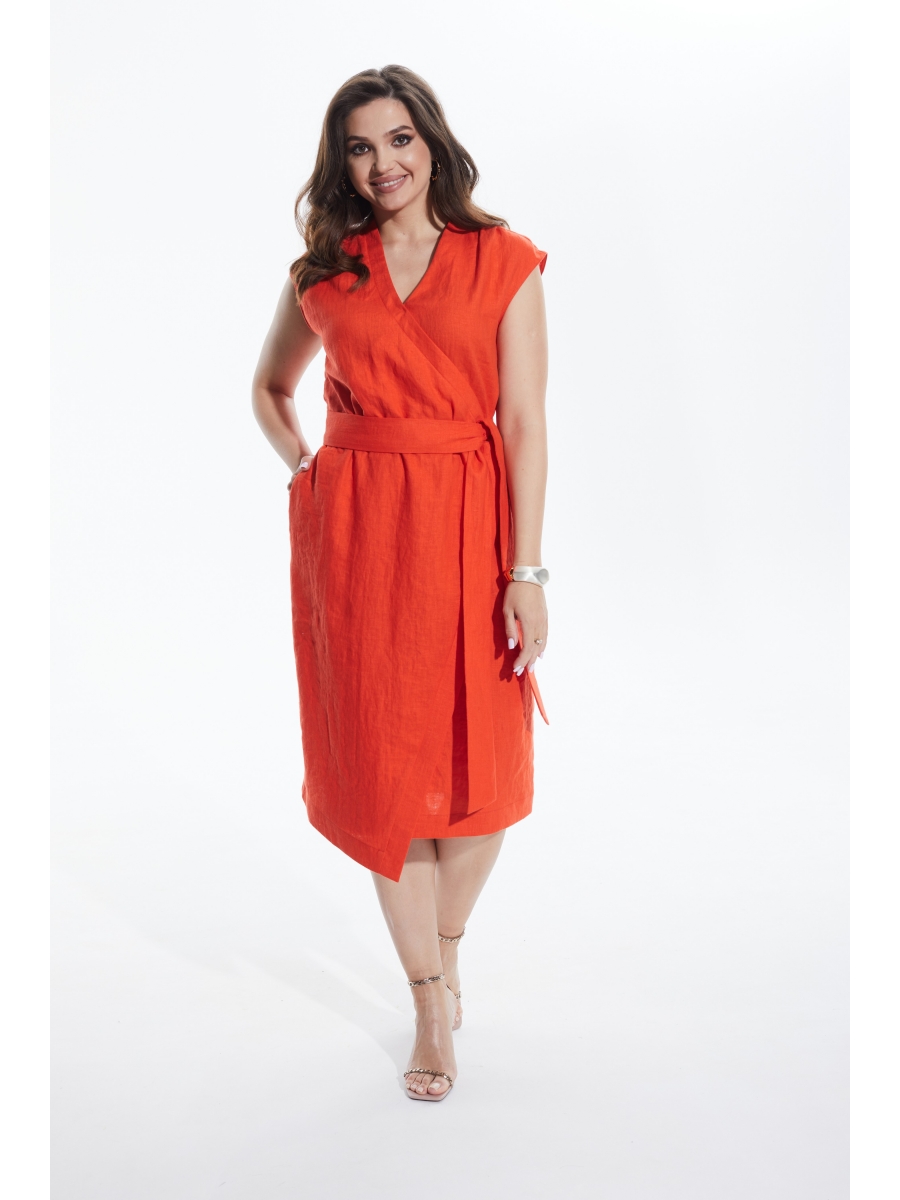 Платье льняное от MALI прямого силуэта, слегка зауженное книзу, отрезное по талии, собранное на резинку. Перед с имитацией запаха, край которого на отделочной планке, в нижней части правая половинка выполнена наклонно с выступающим углом по низу. В боковых швах - карманы. Горловина V-образной формы на стойке по спинке. Платье без рукавов со спущенным плечом. Платье в комплекте со съёмным поясом из основной ткани.
