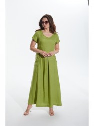 Платье от MALI длинное, расширенное книзу с накладными карманами, красивой встречной складкой спереди и боковыми разрезами. По центру спинки вшита молния, пуговицы выполнены из натурального кокоса.