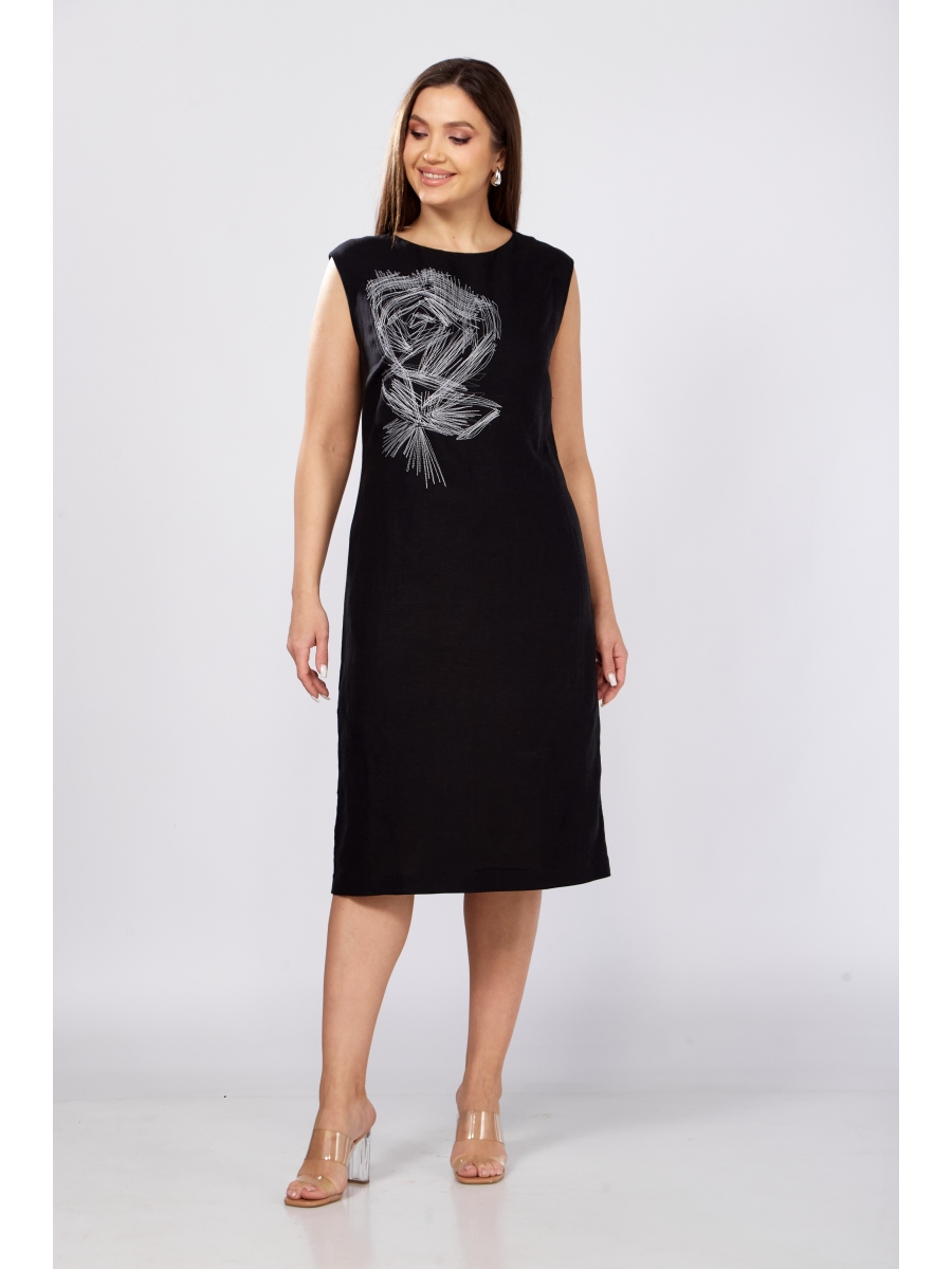 Платье полуприлегающего силуэта, слегка расширенное к низу. Спинка со средним швом . По переду нагрудные вытачки и декоративная вышивка контрастной нитью. Горловина округлой формы. Плечо спущенное. В боковых швах карманы.