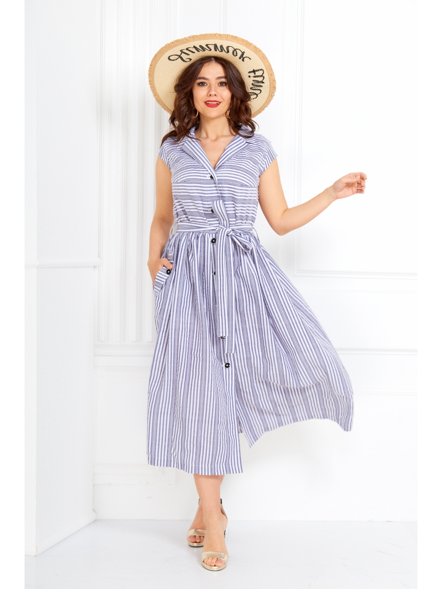 Платье женское из текстильной ткани в полоску, отрезное по линии талии, на резинке. Застежкак на петли/пуговицы. В верхней части полочки идет грудовая выточка из бокового шва. Юбка со сборкой по линии талии, по бокам карманы с клапоном и пуговицей. Воротник "английского" типа, рукав в виде "крылышка".