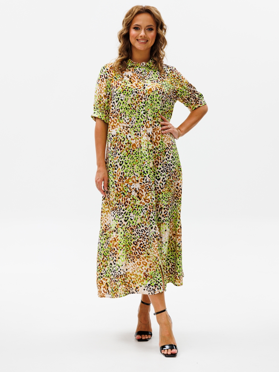 Платье А-образного силуэта выполнено из вискозной штапельной ткани. Платье с рубашечным воротником и центральной застежкой на 12 петель и пуговиц. Перед с нагрудной вытачкой. Рукав втачной одношовный с притачной манжетой на 1 петлю и пуговицу. По линии притачивания - сборка. По низу платья притачан волан со сборкой.