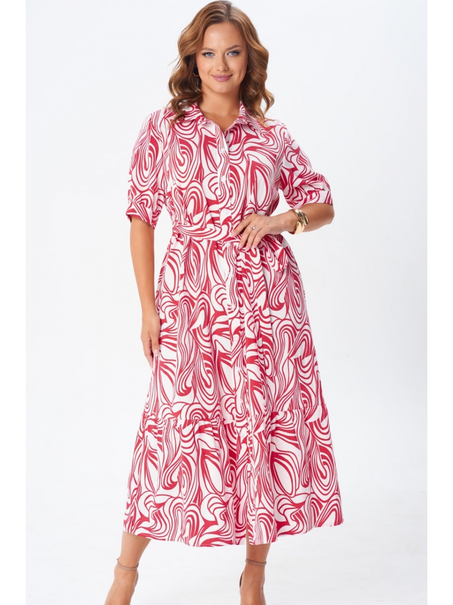 Платье А-образного силуэта выполнено из вискозной ткани с летним принтом. Платье с рубашечным воротником и центральной застежкой на петли и пуговиц. Перед с нагрудной вытачкой. Рукав втачной одношовный с притачной манжетой на петлю и пуговицу. По линии притачивания - сборка. По низу платья притачан волан со сборкой.