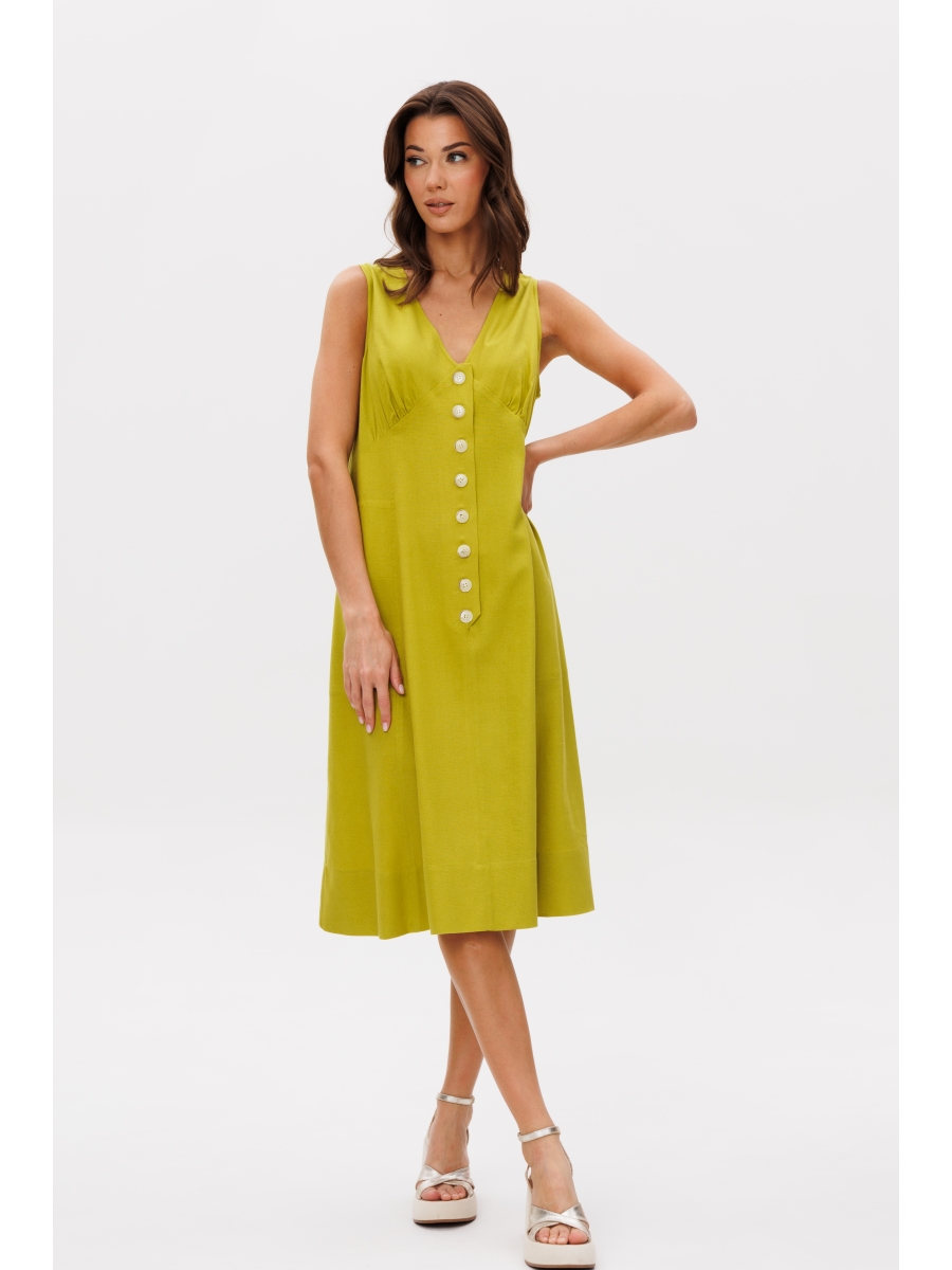Оформить заказ →Лен-неотъемлемый спутник для всех, кто планирует проводить лето в городе и не хочет умереть от жары. Самая популярная модель платья изо льна-вариация А-силуэта в длине миди. Благородное без дополнительных усилий по стилизации-за это отвечает само полотно и тщательно подобранная фурнитура. Полуприлегающий силуэт, V-образный вырез, рельефы-конически расширяющиеся к низу. Эффектный подрез со сборкой в верхней части полочки и необычная частичная застежка с петлями и пуговицами. Спинка со средним швом и вертикальными рельефами.