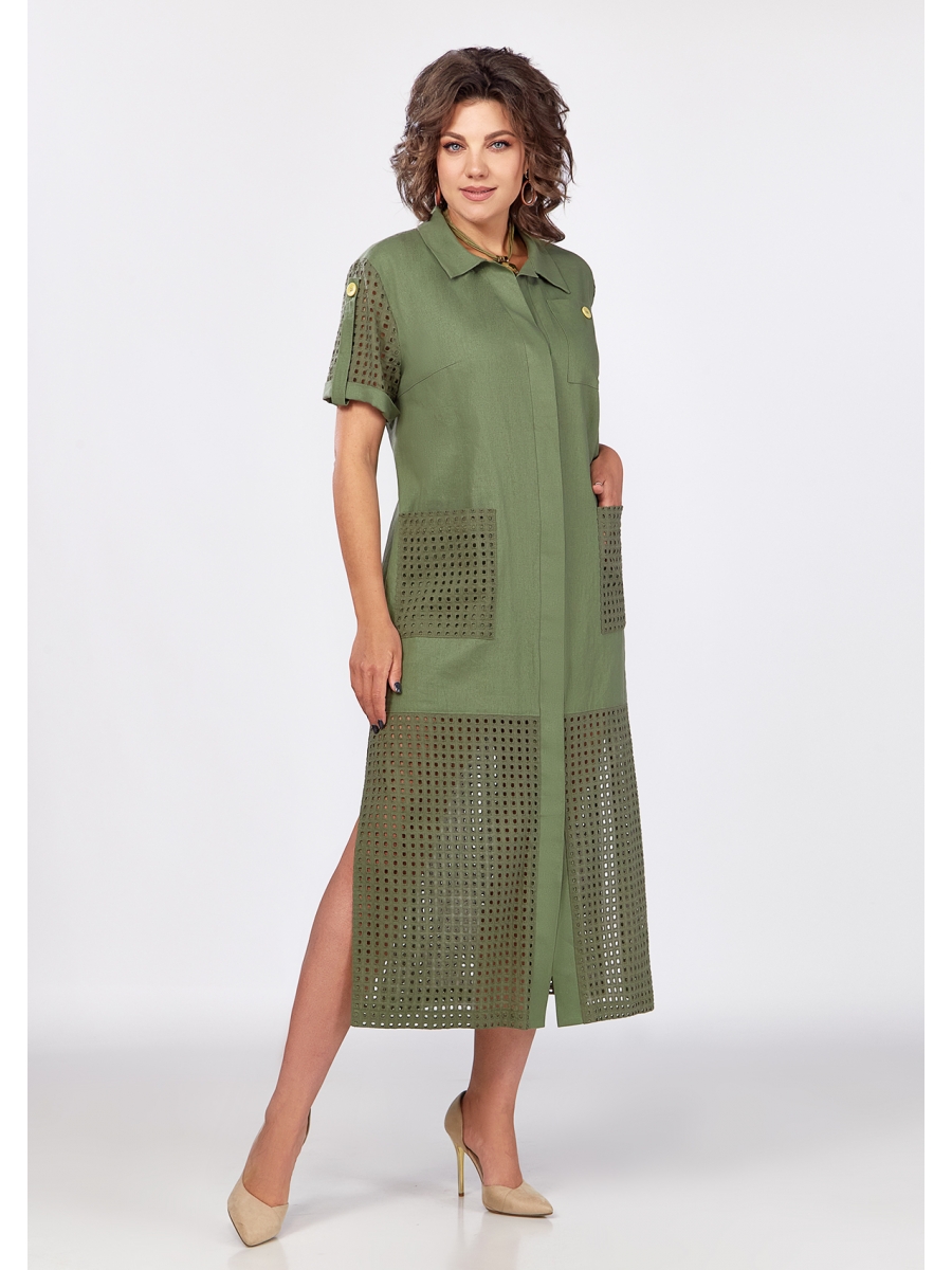 Летнее платье прямого покроя, выполненное из льна и хлопка с вышивкой. Полочка с застежкой на планку с потайной застежкой на пуговицы. Горловина обработана втачным воротником. Также на полочке обработан накладной карман по линии груди из льна, и по линии бедер два накладных кармана из хлопка с вышивкой. Нижняя часть платья также выполнена из хлопка с вышивкой, с боковыми разрезами, сто придает платью эффектности. Рукав втачной, из хлопка с вышивкой, по низу на манжете и с патой из льна с застежкой на пуговицу. Спинка выполнена из льна, со средним швом и вытачками, нижняя часть юбки также как выполнена из хлопка с вышивкой.