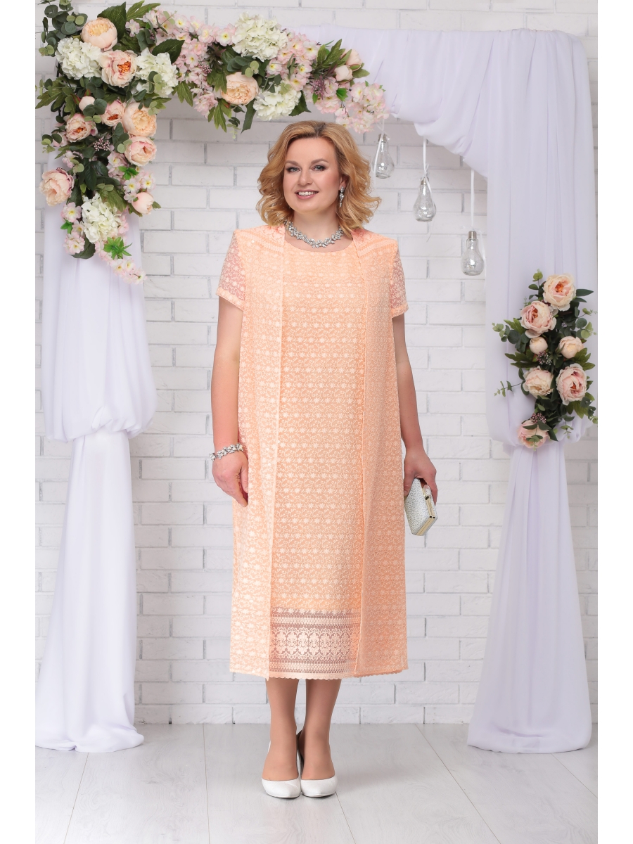 Платье женское, силуэта “трапеция”, из шифона с вышивкой и пайетками, на подкладке из хлопчатобумажной ткани. Длина платья посередине спинки 115,0 см. На детали переда отлетные детали, скреплённые с платьем по пройме и по плечевым швам. Нагрудные выточки выходят из проймы. Спинка с талевыми выточками. Горловина круглая, спереди углублённая, обтачная. Рукава втачные, одношовные, длиной 20,0 см., пройма окантованная. Изделие с плечевыми накладками.