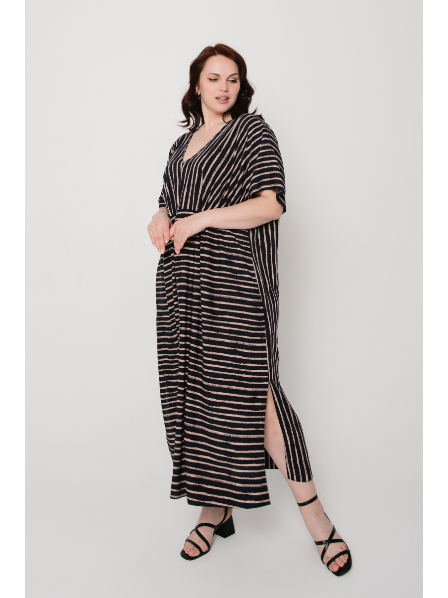Платье женское прямого силуэта из набивного штапеля, с разрезами и карманами в боковых швах. Перед с подрезом, рукав цельнокроенный, короткий, горловина V-образная. Размеры сдвоенные.