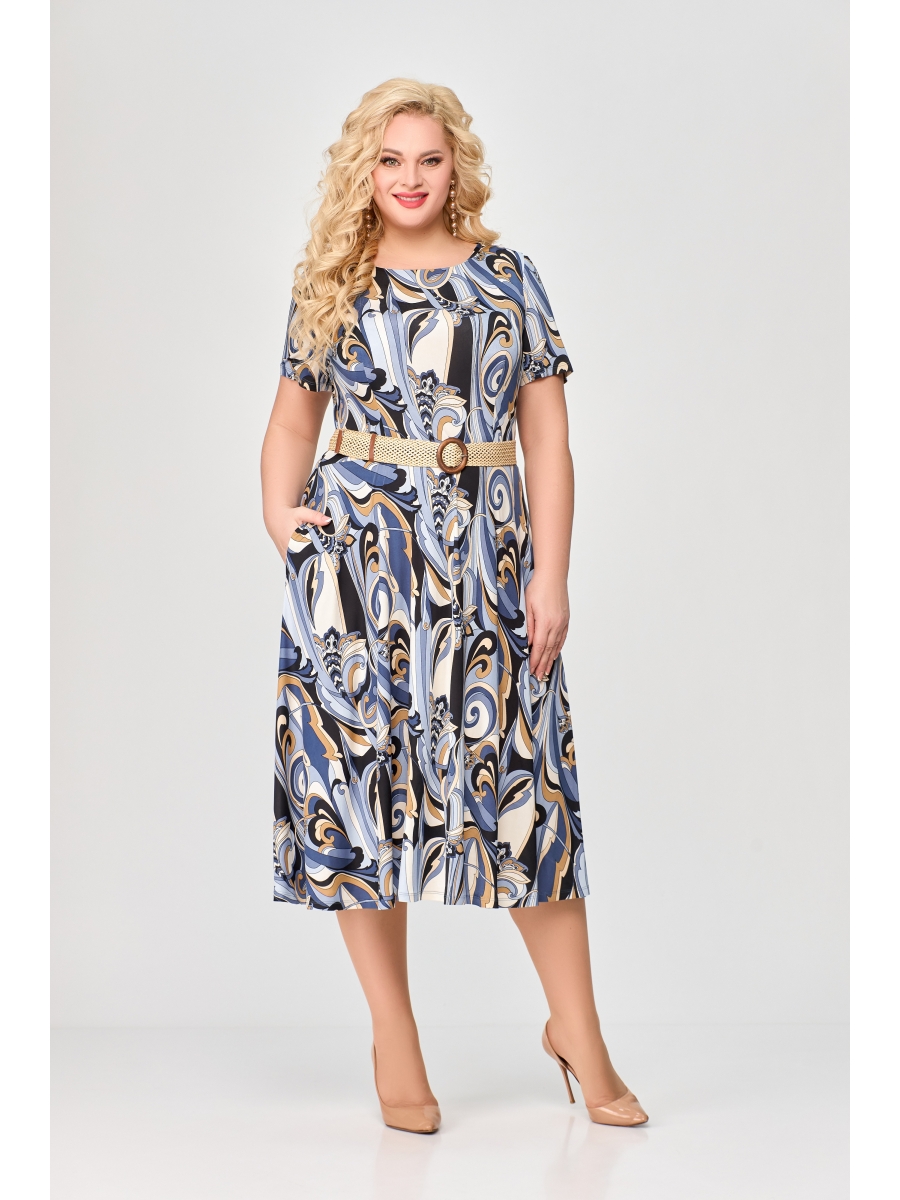 Платье из тонкого эластичного трикотажного полотна «масло» полуприлегающего силуэта, отрезное по линии талии. По переду и спинке лифа расположены талиевые вытачки. Юбка расклешённая с карманами в боковых швах. В среднем шве спинки предусмотрена молния. Рукав втачной короткий.