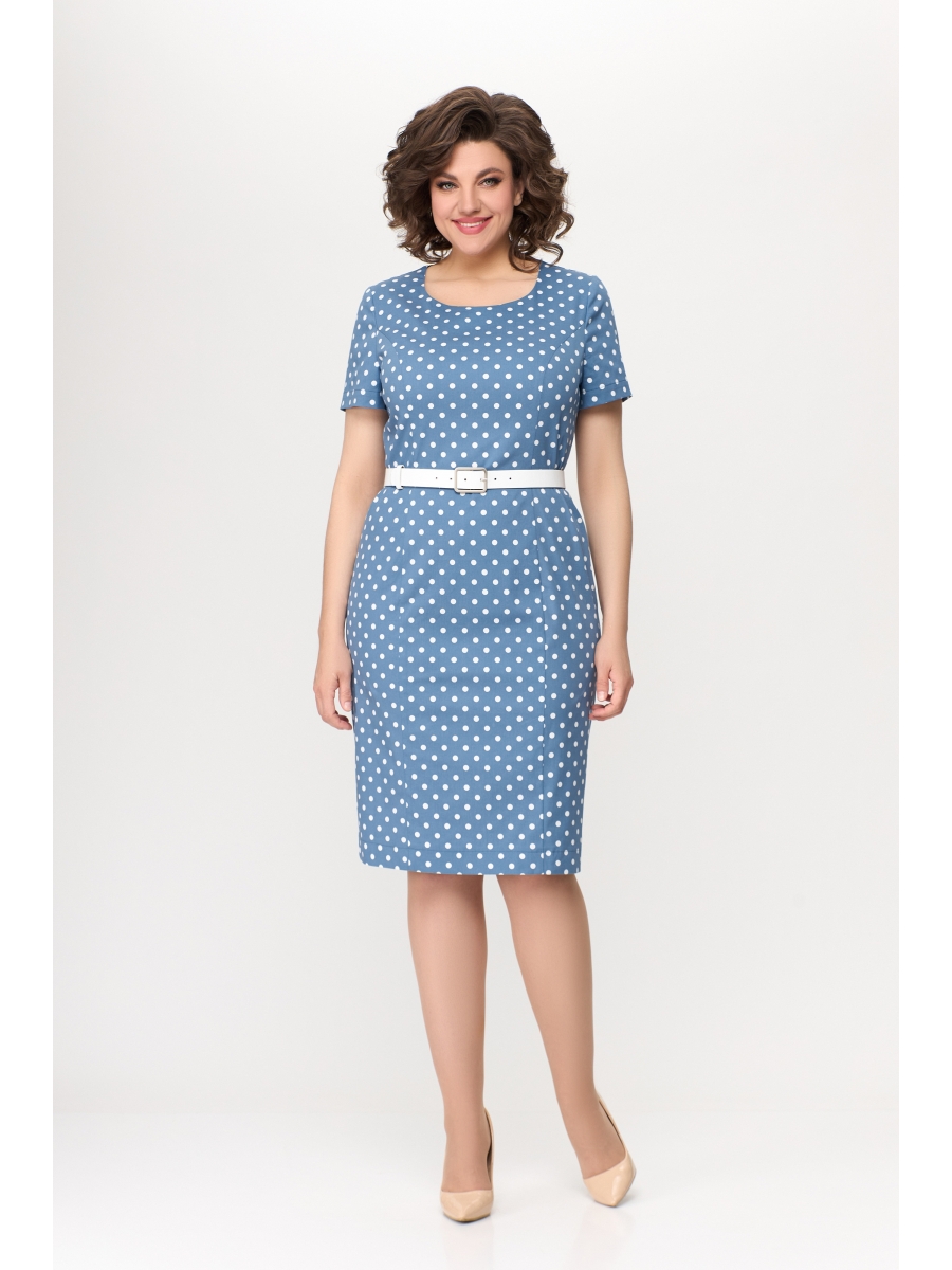 Платье полуприлегающего силуэта из эластичной хлопковой ткани (тонкий деним). Горловина платья круглая. По переду платья расположены рельефные швы. Спинка с рельефными швами и средним швом, в который вставлена потайная молния. По низу спинки обработана шлица. Рукав короткий, втачной, одношовный.