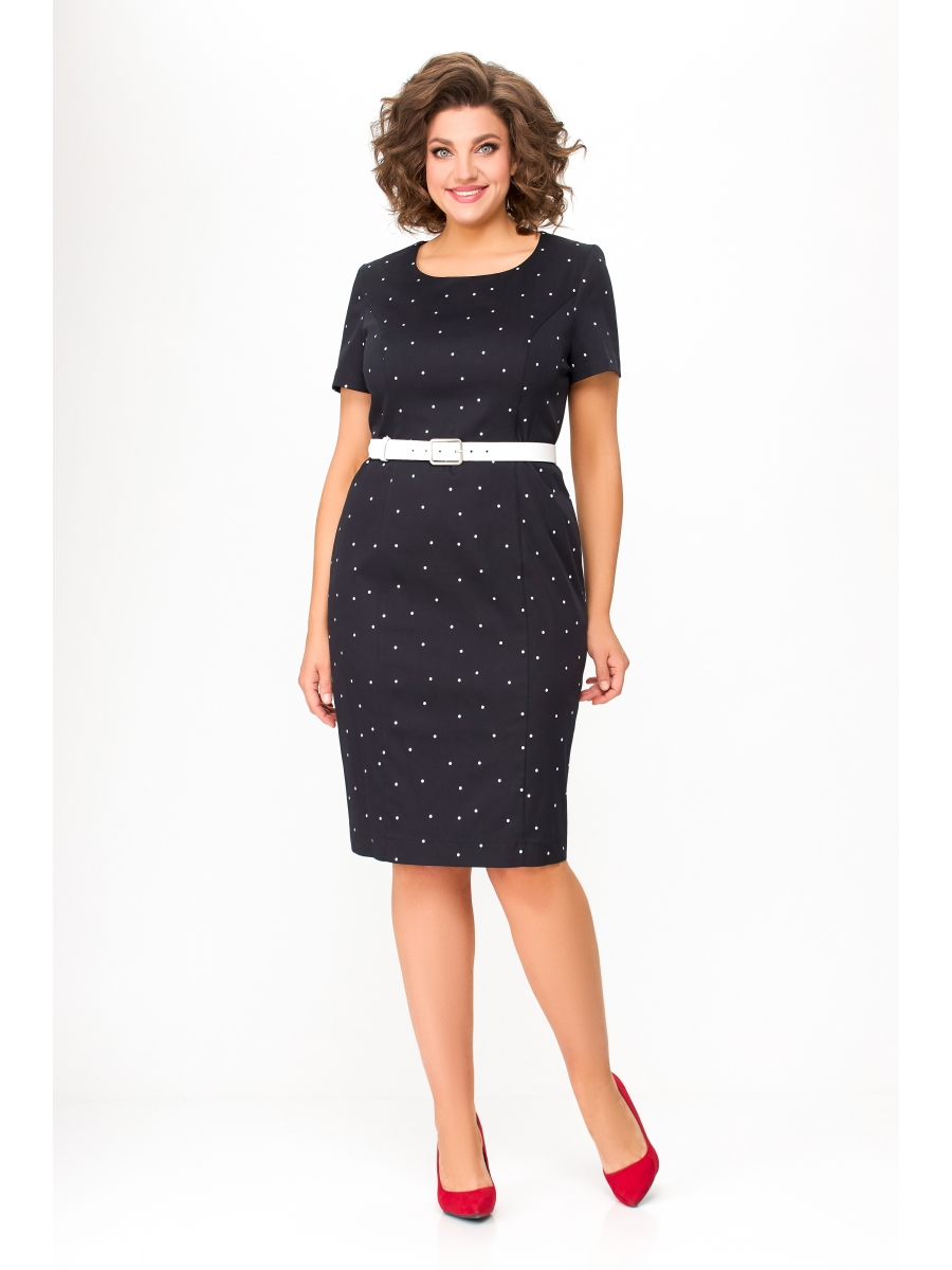 Платье полуприлегающего силуэта из эластичной хлопковой ткани (тонкий деним). Горловина платья круглая. По переду платья расположены рельефные швы. Спинка с рельефными швами и средним швом, в который вставлена потайная молния. По низу спинки обработана шлица. Рукав короткий, втачной, одношовный.