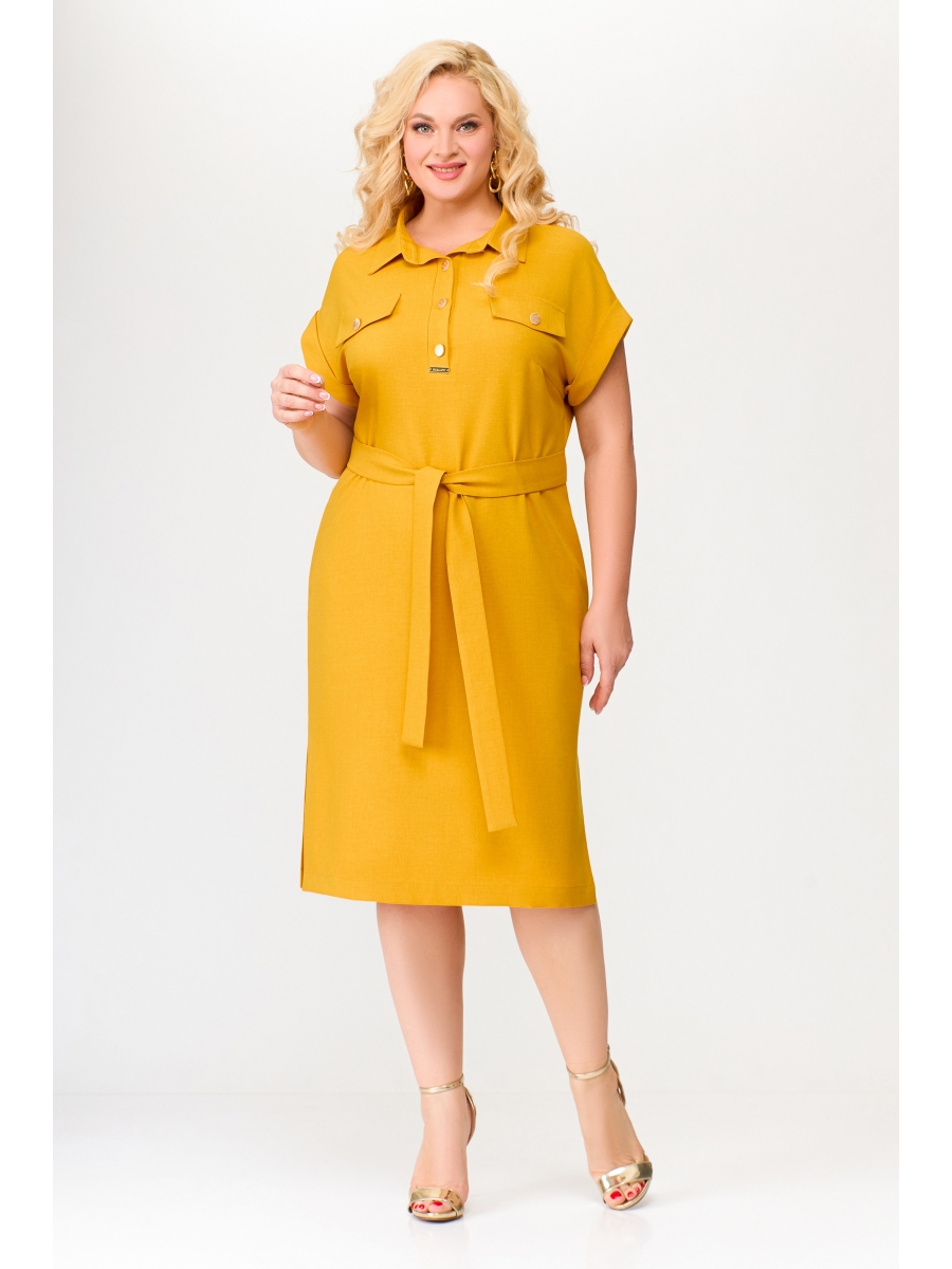Платье из мягкой вискозно-льняной ткани полуприлегающего силуэта. По переду обработаны нагрудные вытачки и планка до линии груди, застёгивающаяся на 4 петли и 4 декоративные металлические пуговицы. По переду платья расположены два нагрудных клапана с пуговицами. Воротник рубашечный с отрезной стойкой. Рукав цельнокроеный, короткий, спущенный с отложной манжетой по низу. В комплекте пояс из основной ткани.