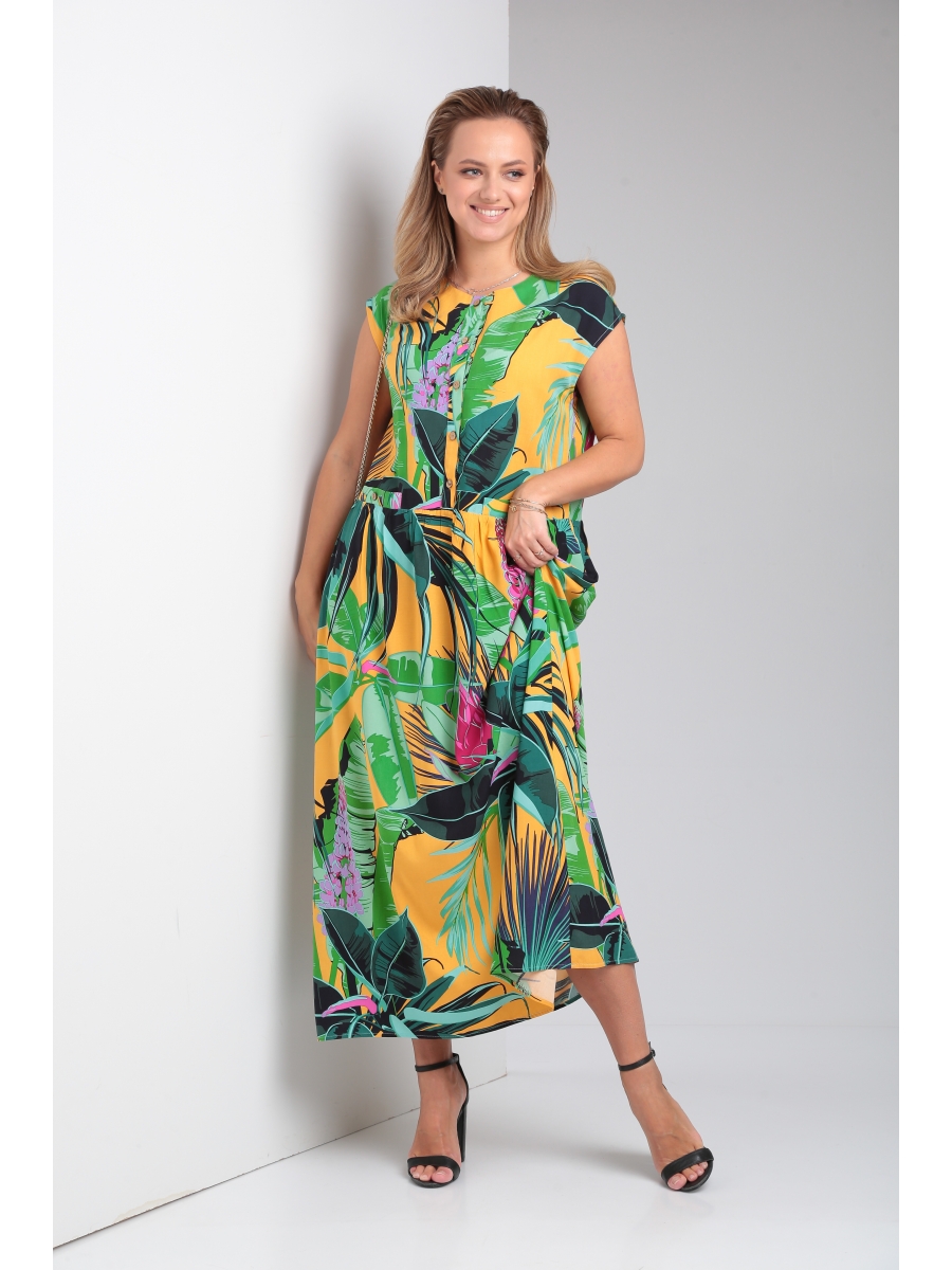 Платье летнее свободного покроя из вискозы с ярким принтом, отрезное чуть ниже линии талии. По переду лифа отрезная планка на петли и пуговицы, функциональные карманы с листочкой. Линия плеча спущена. Горловина округлой формы. Нижняя часть платья присобрана по линии притачивания.