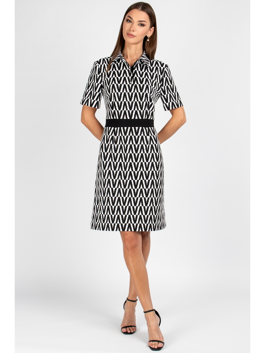 Платье женское полуприлегающего силуэта, отрезное по линиям талии. Линия талии с отделочной эластичной тесьмой. На полочке застежка на петли и пуговицы. Рукав втачной короткий.