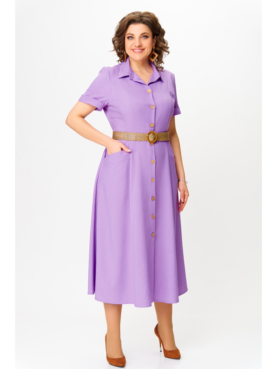 Платье из мягкой вискозно-льняной ткани, отрезное по линии талии с полуприлегающим лифом и юбкой А-силуэта, с центральной застёжкой на петли и декоративные пуговицы. Полочка с вертикальными рельефами, спинка с кокеткой и отрезными бочками. Юбка состоит из семи клиньев. По переду между швами обработан карман с планкой на косую. Воротник отложной рубашечного типа, с отрезной стойкой. Рукав втачной короткий, по низу с отложной манжетой.