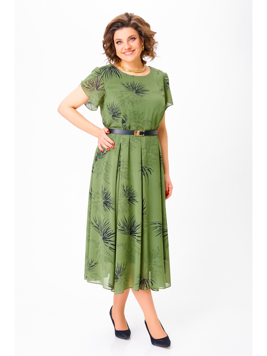 Платье из шифона на трикотажной подкладке, Х-образного силуэта с полуприлегающим лифом. Платье отрезное по линии талии. По переду лифа расположены рельефы, по спинке лифа талиевые выточки. Юбка расклешенная из шести клиньев со встречными складками по линии талии. В среднем шве спинки предусмотрена потайная тесьма- молния. Рукав втачной покроя тюльпан.