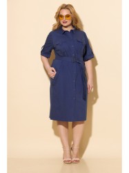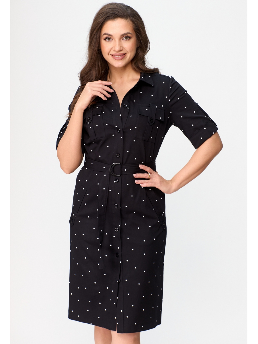 Платье в стиле сафари, полуприлегающего силуэта. По переду центральная застежка с планкой на петли-пуговицы, прорезные карманы с втачной листочкой и декоративным хлястиком. Воротник отложной на стойке. Спинка со средним швом и отрезной кокеткой в верхней части. Рукав втачной, одношовный, с отложной манжетой и декоративным хлястиком.