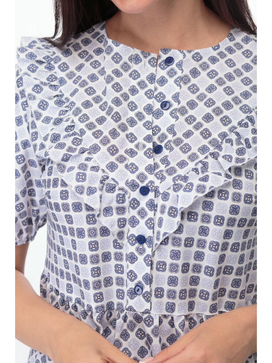 По переду и спинке V-образные притачные кокетки, оформленные рюшем, по центру обработана планка с застежкой на петли и пуговицы, нижняя часть образуется присборенными каскадами.