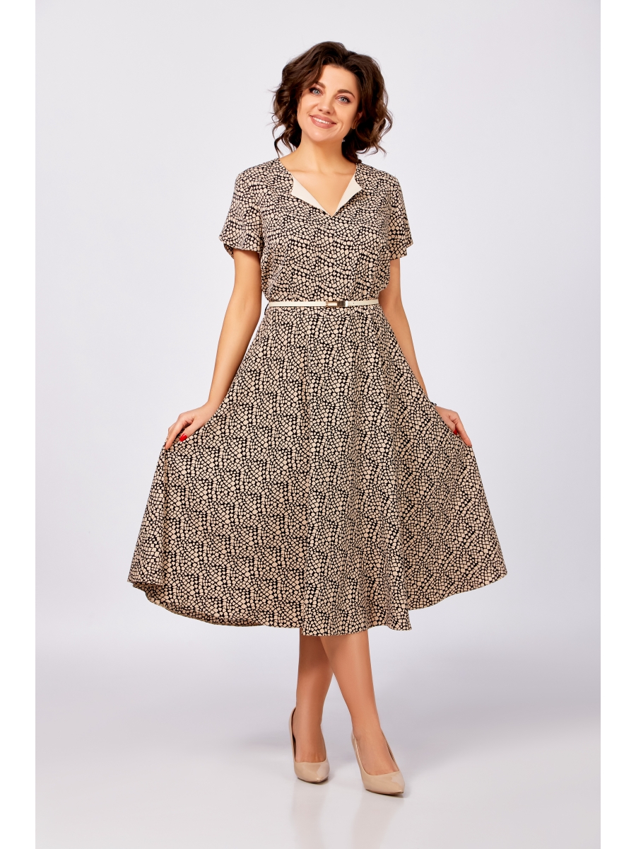 Платье из струящейся вискозной ткани, отрезное по линии талии. Лиф полуприлегающего силуэта. По полочке лифа центральный шов, нагрудные и талиевые вытачки, по спинке средний шов и талиевые вытачки. Горловина V-образной формы с отложным воротничком из отделочной ткани. Юбка расклешенная. Рукав втачной короткий, формы «тюльпан». В среднем шве спинки застёжка на потайную тесьму-молнию.