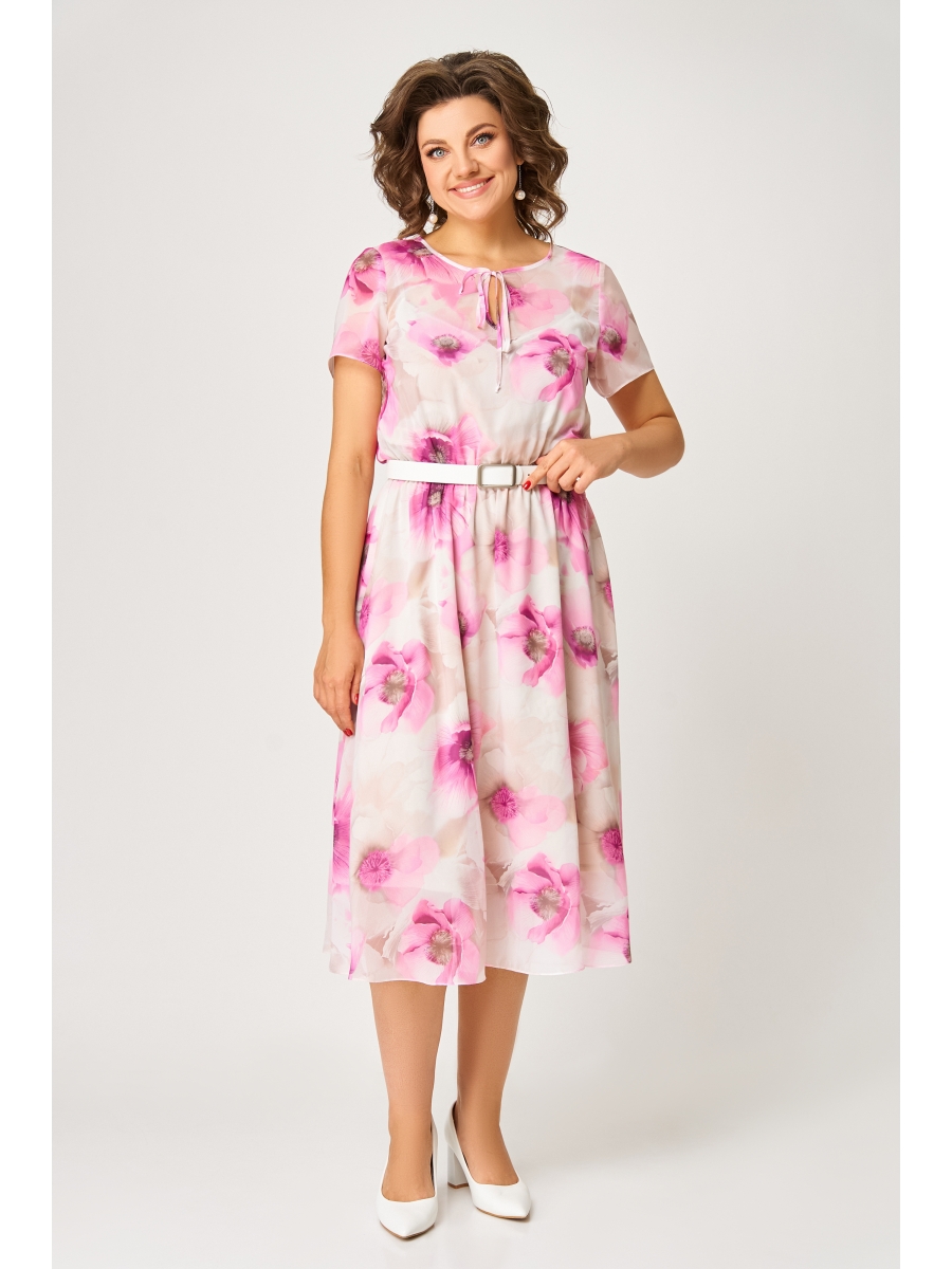 Платье из мягкой шифоновой ткани, на трикотажной подкладке, отрезное по линии талии, шов собран на эластичную тесьму-резинку. Горловина округлой формы, по переду капелька с завязкой. Рукав втачной, короткий. Юбка расклешённая. Подкладка лифа платья на бретелях.