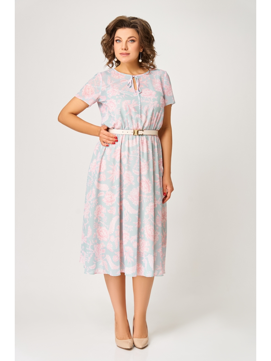 Платье из мягкой шифоновой ткани, на трикотажной подкладке, отрезное по линии талии, шов собран на эластичную тесьму-резинку. Горловина округлой формы, по переду капелька с завязкой. Рукав втачной, короткий. Юбка расклешённая. Подкладка лифа платья на бретелях.