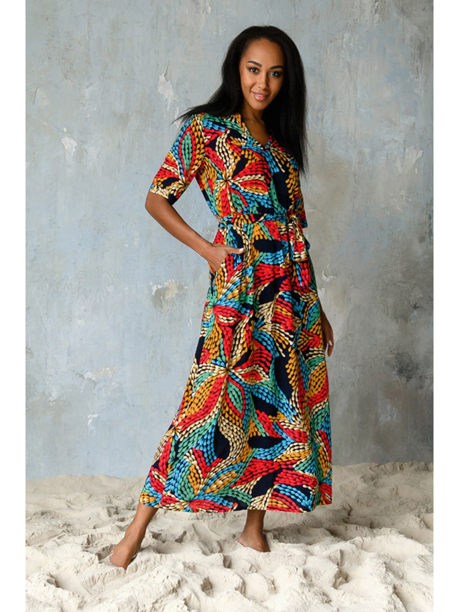 Платье выполнено из принтованной яркой вискозы. Модель на поясе свободного силуэта длиной в пол. Рукав прямой длиной до локтя. Фигурный вырез горловины с обтачкой. В боковых швах карманы.