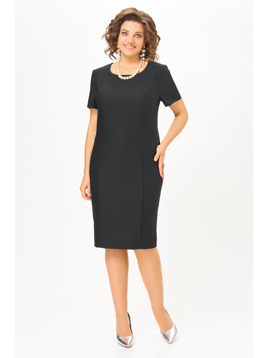 Платье полуприлегающего силуэта из поливискозной ткани с мягким блеском. По полочке выполнены рельефные швы, по спинке рельефные швы, средний шов со шлицей и застёжка на потайную тесьму-молнию. Горловина круглая, обработана обтачкой. Рукав втачной, короткий.