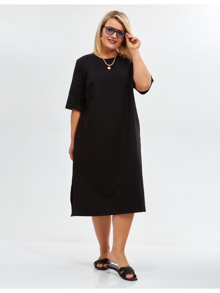 Платье типа «удлиненная футболка» свободного кроя из премиум трикотажа «петля». Платье с короткими и широкими по низу рукавами, с округлой горловиной, в боковых швах карманы и разрезы. Это базовое платье - воплощение свободы движения, естественности уникальности каждой женщины. Женское платье-футболка спорт шик отлично сидит на любом типе фигуры. Свободное современное трикотажное базовое платье больших размеров можно легко стилизовать при помощи аксессуаров для разных событий, на работу и для прогулок.