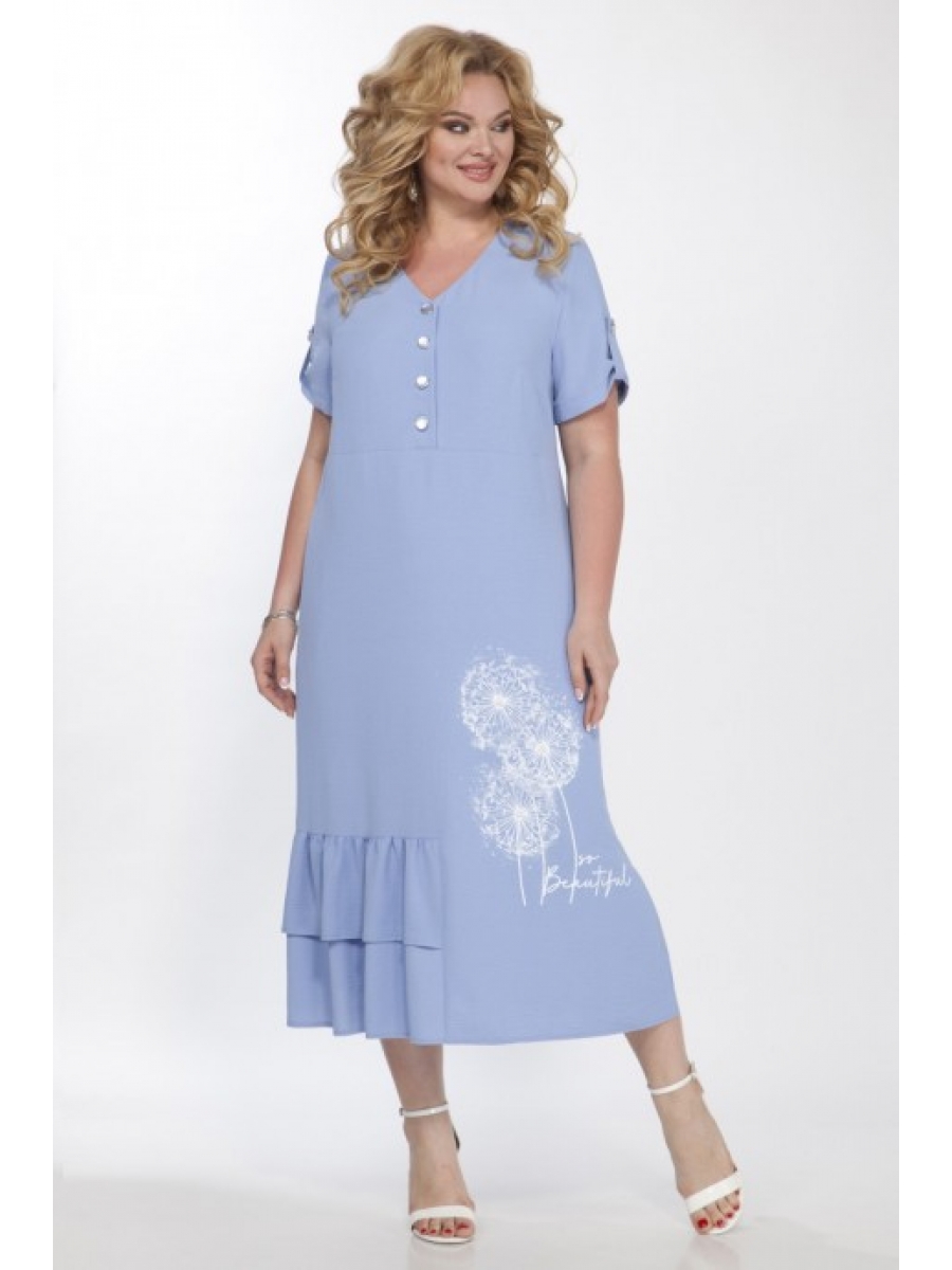 Платье женское прямого силуэта с отрезным лифом по переду и центральной застежкой на 4 пуговицы до линии талии. вырез горловины V-образный. По низу изделия с правой стороны выполнен декоративный волан-вставка,слева-печать. В боковых выполнены разрезы и по линии бедер карманы в швах. Рукав втачной с патами, застегивающимися на пуговицы.