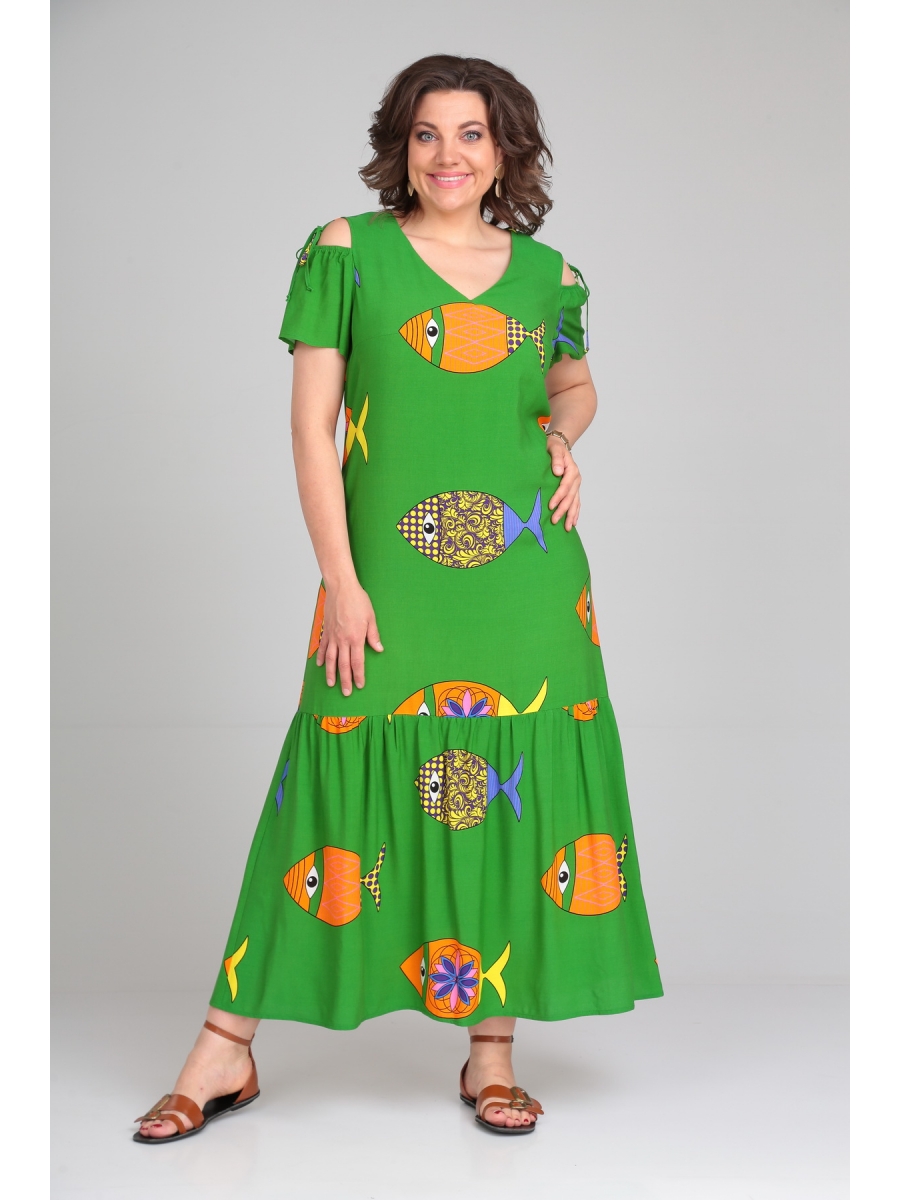 Воздушное летнее платье свободного силуэта, выполненное из штапеля (не тянется), без подкладки. Перед с нагрудными вытачками. Спинка цельная. Низ платья оформлен присборенным воланом. Горгловина V-образной формы. Рукава втачные с отрезным окатом на резинке и с декоративной завязкой.