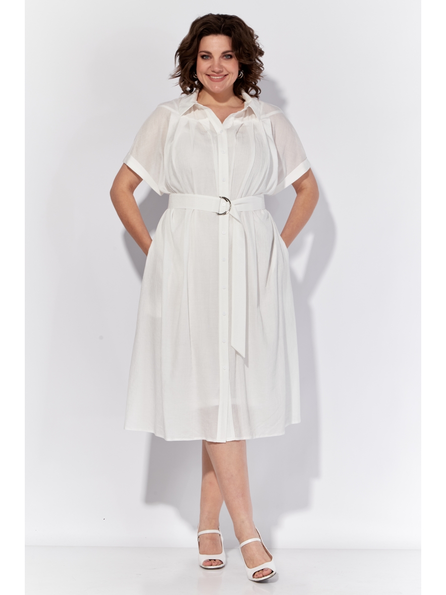 Свободное платье со сквозной застежкой планкой на пуговицы. От круглой кокетки заложены глубокие складки. Рукав спущенный с отворотом. Пояс из основной ткани.