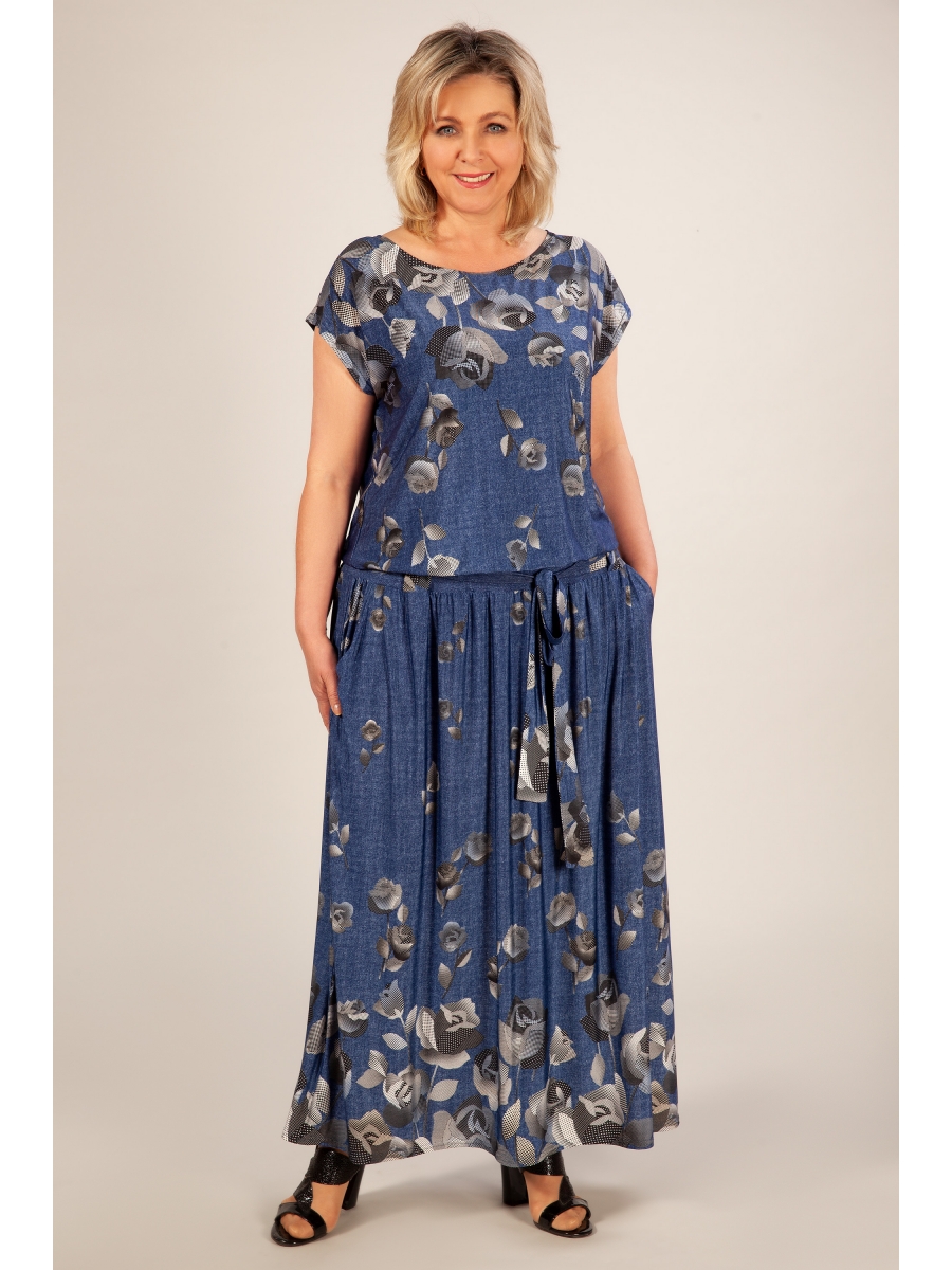 Восхитительное женское платье, выполнено из лёгкого, струящегося трикотажного полотна с оригинальным цветочным принтом. Длинное в пол, вырез горловины округлый, плечо приспущено. Чуть-чуть занижена линия талии на резинке, что позволяет регулировать длину юбки. Кокетка на бёдрах с поясом продетым через шлёвки. Имеются боковые карманы.
