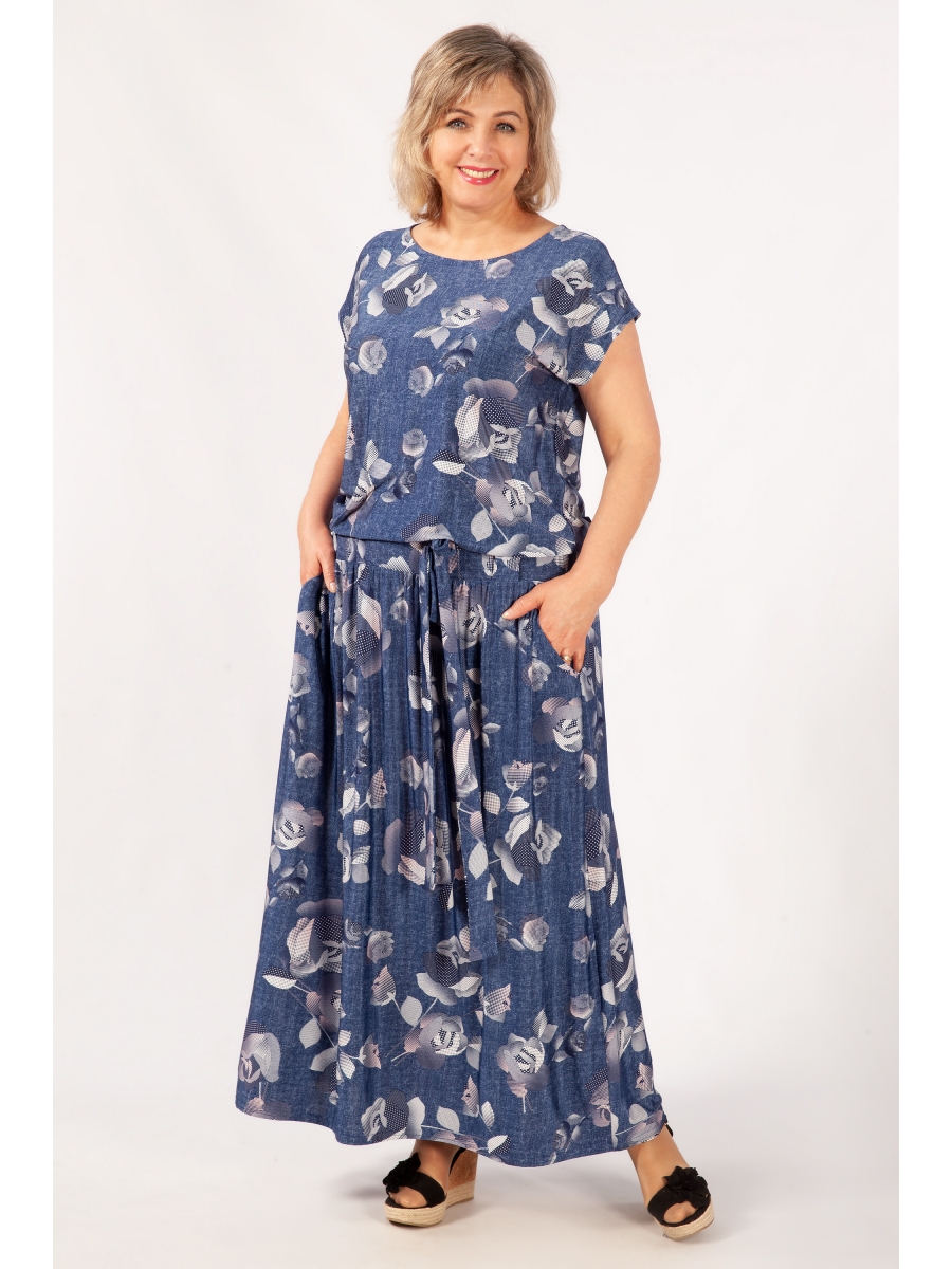 Восхитительное женское платье, выполнено из лёгкого, струящегося трикотажного полотна с оригинальным принтом. Длинное в пол, вырез горловины округлый, плечо приспущено. Чуть-чуть занижена линия талии на резинке, что позволяет регулировать длину юбки. Кокетка на бёдрах с поясом продетым через шлёвки. Имеются боковые карманы.