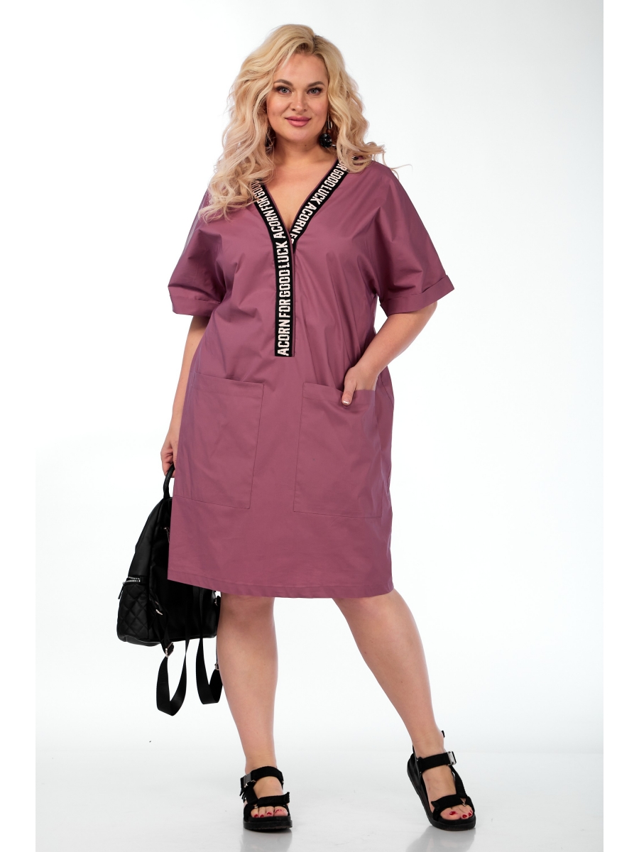 Платье женское, прямого силуэта. Длина до середины колена. Рукав цельнокроенный, до локтя. Низ рукава оформлен цельнокроенной манжетой с отворотом. Вырез горловины V-образный, оформлен притачными планками с декоративной резинкой. По переду выполнены накладные карманы.