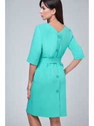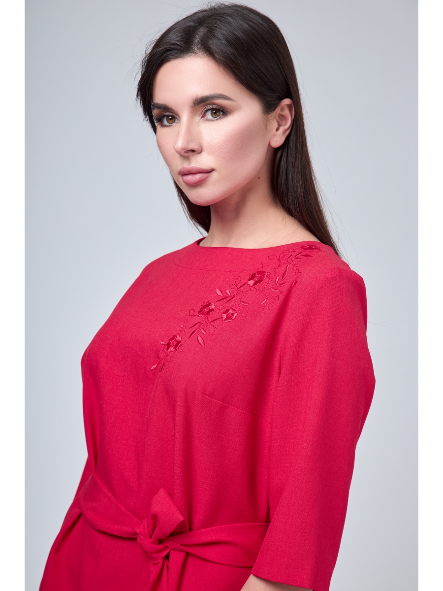 Любимая нами модель повседневного платья для ярких будней! Прямой силуэт, элегантный вырез округлой формы по переду и v-образный по спинке, втачной 3/4 рукав. Удобные карманы в боковых швах. По среднему шву спинки имитация застежки на пуговицы. Дополнено съёмным завязывающимся поясом. Правильная длина ниже колена.