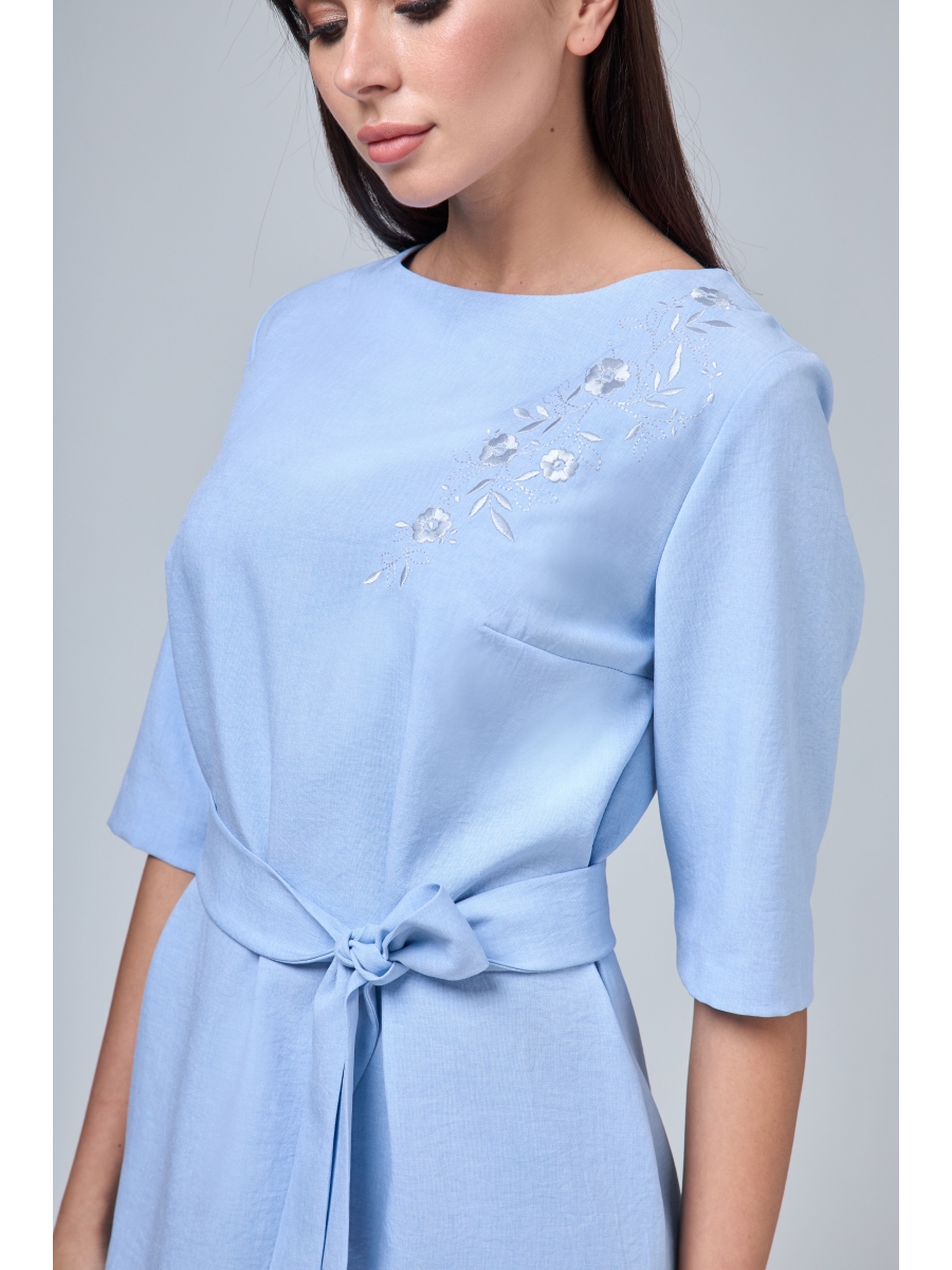 Любимая нами модель повседневного платья для ярких будней! Прямой силуэт, элегантный вырез округлой формы по переду и V-образный по спинке, втачной 3/4 рукав. Удобные карманы в боковых швах. По среднему шву спинки имитация застежки на пуговицы. Дополнено съёмным завязывающимся поясом. Правильная длина ниже колена.