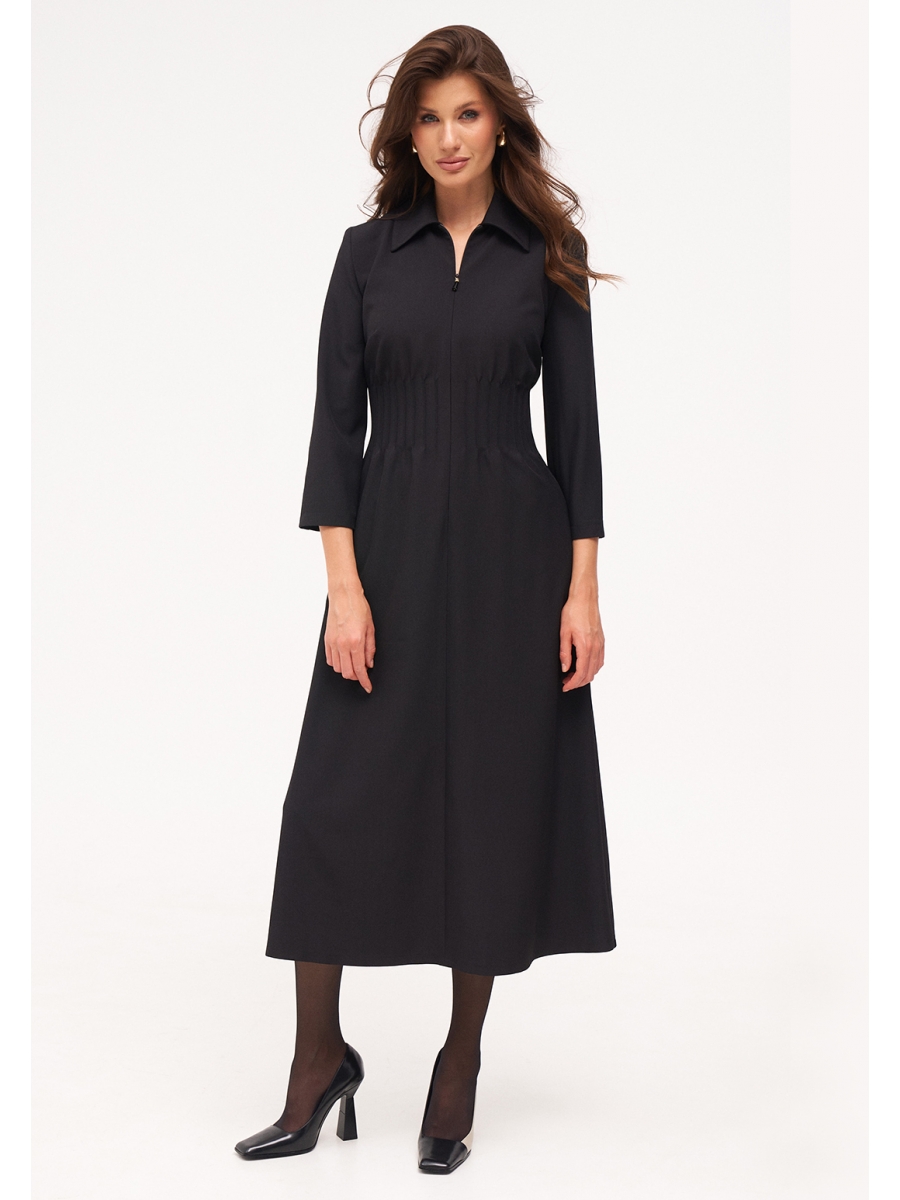 Платье А-образного силуэта из костюмно-плательной ткани. По талии спереди декоративные защипы, сзади - кулиса со шнуром для регулирования приталивания. Длина рукава 7/8. По бокам карманы. Застёжка на потайную молнию спереди.