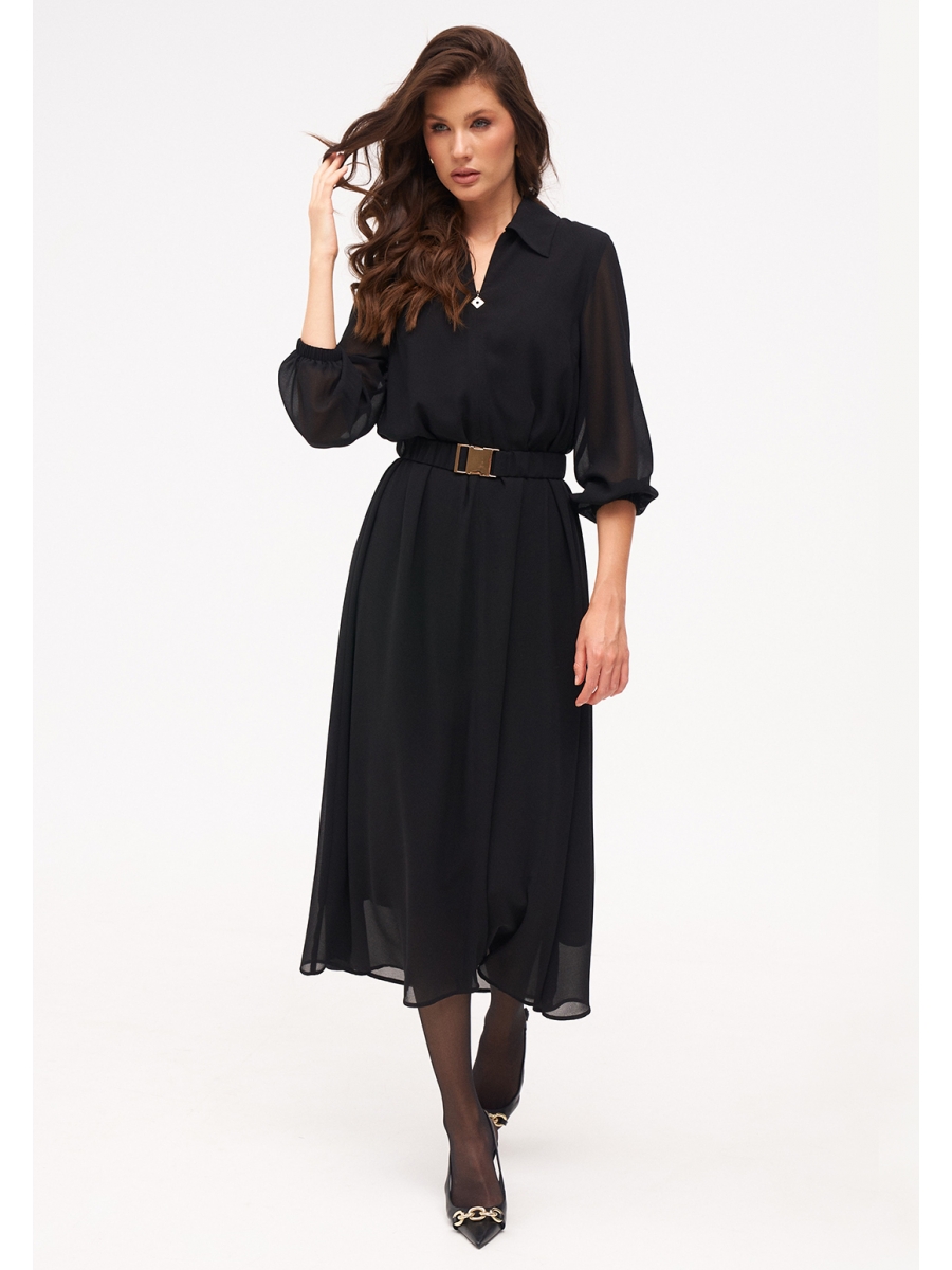 Платье А-образного силуэта длины миди из струящегося шифона. Длина рукава 7/8 с низом на резинке. Застёжка на потайную молнию спереди. Комплектуется текстильным ремнём на резинке с металлической пряжкой.
