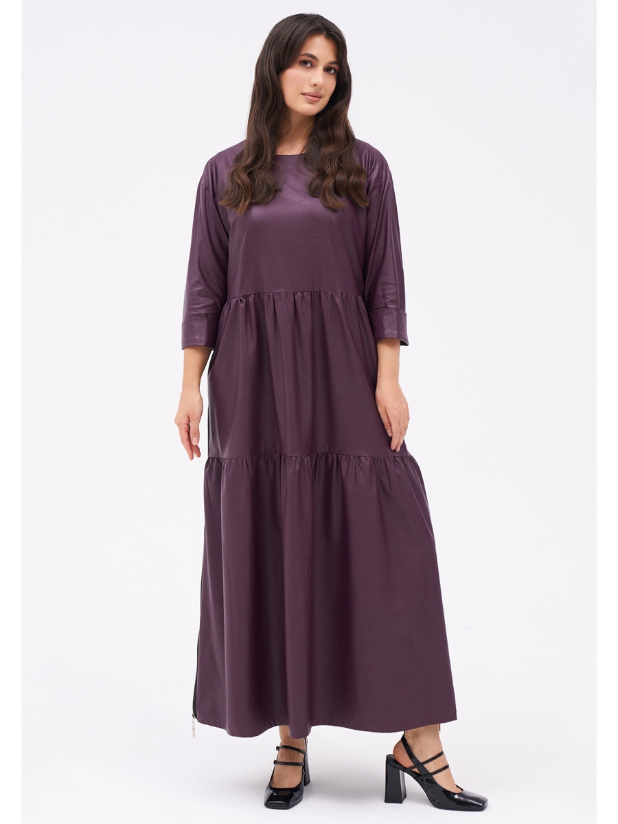 Платье длиной миди из тонкой экокожи с хлопковой изнанкой. Отрезное по талии. Юбка делится на два присборенных волана с декоративными молниями по бокам. Длина рукава 3/4.