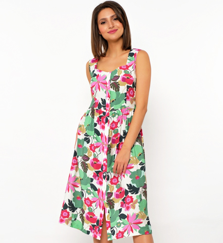 Элегантное женское платье из текстильной ткани. Отрезное по линии талии. По полочке объем груди создается за счет направленных складок из подреза. Объем юбки создается за счет центральной встречной и 2-х односторонних складок. По бокам в юбке-карманы. Юбка на подкладке. Рукав втачной, 3/4 длинны с отворотом. Вырез горловины лодочка с отложным воротником.