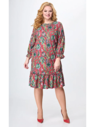 Платье из смесовой ткани с красивым, акварельным принтом. Прямой силуэт. Втачные укороченные рукава, понизу присборены на резинке. Вырез горловины округлый с декоративным элементом-цепочкой. Низ платья украшает притачной волан. Элегантное платье для ваших мероприятий