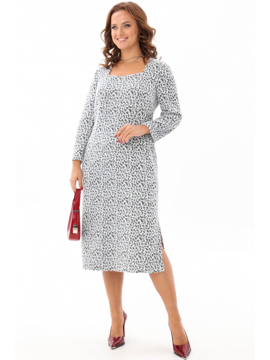 Платье прямого силуэта длиной миди. Горловина с вырезом "каре". По переду платья нагрудные вытачки. В боковых швах обработаны разрезы. Рукав втачной прямой длиной 7/8.