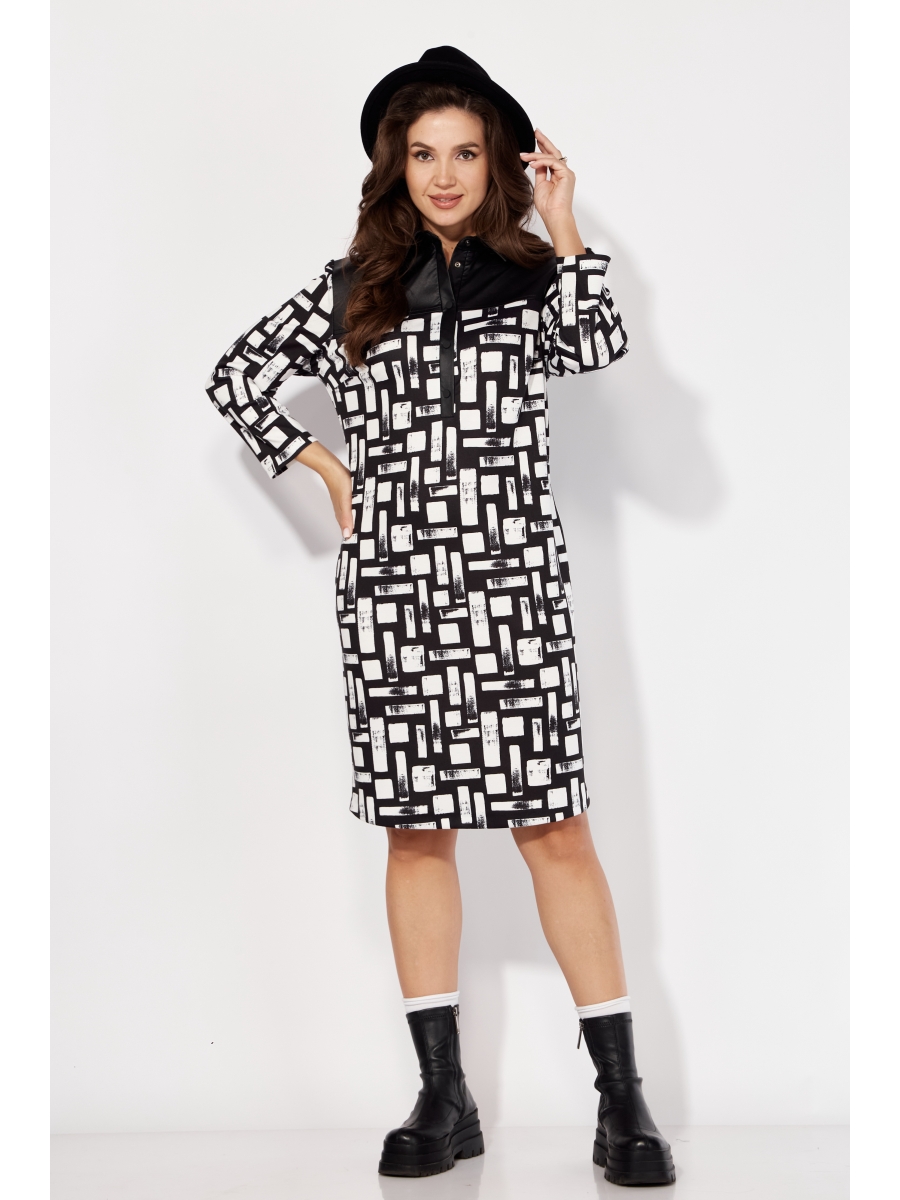 Оформить заказ →Платье женское, полуприлегающего силуэта с втачным рукавом длинной 7/8. По переду нагрудные вытачки и кокетка. Воротник отложной, на отрезной стойке. Застежка по центру с удлиненной планкой "поло" на кнопках. Карманы в боковых швах. По спинке кокетка и талевые вытачки. Платье выполнено из трикотажного полотна с отделкой из экокожи (кокетка, воротник, планка).