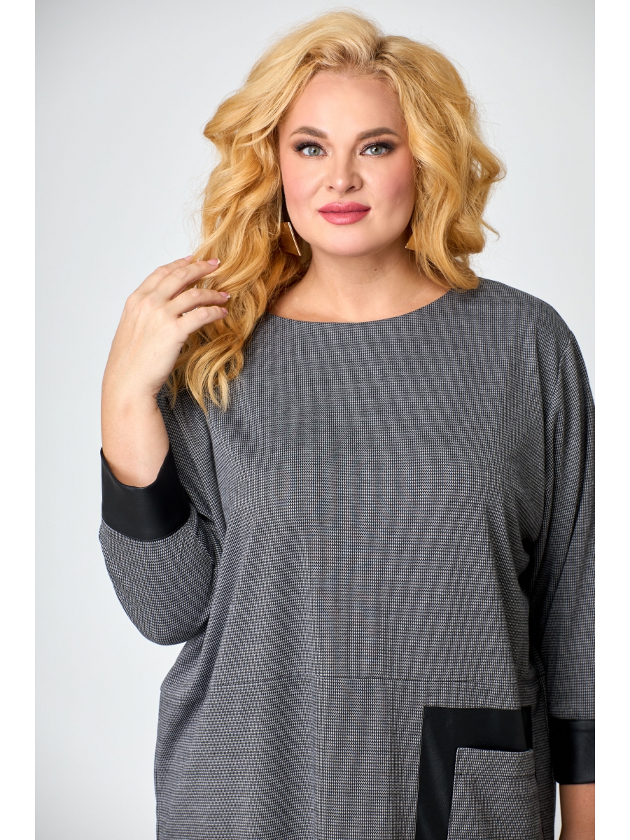 Платье женское прямого силуэта, длина ниже колена. Спущенная линия плеча, рукав 3/4, низ на манжете из экокожи. Платья отрезное по линии талии. По переду слева декоративная деталь из экокожи и функциональный накладной карман, в боковых швах разрезы придающие платью игривости. Горловина в форме лодочки. Минималистичный дизайн, игра на акцентах, свободный крой придаст вашему образу свежести и будет актуален вне сезонов.