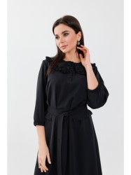 Платье женское, прямого силуэта, чуть расширенное к низу, длина за колено. Рукав втачной, длина 3/4, низ на резинке. По переду нагрудные вытачки и застежка на петли пуговицы до талии. Горловина обработана отложным воротником с рюшей. Дополнительно талию можно подчеркнуть при помощи съемного пояса. Стильное, женственное и многофункциональное платье станет отличным дополнением вашего образа.