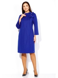 Платье женское, чуть А-силуэта, с втачным рукавом, длинной 7/8. По центу переда объемные, фигурные рельефы. Горловина оформлена небольшой мягкой стойкой. Декором служат съемные цветки-броши. По низу платья отделочная нашивка. Спинка со средним швом.